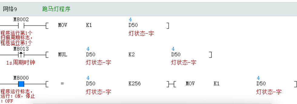 第一行程序,利用M8002上升沿,上电导通一次,给D0赋初值1;
