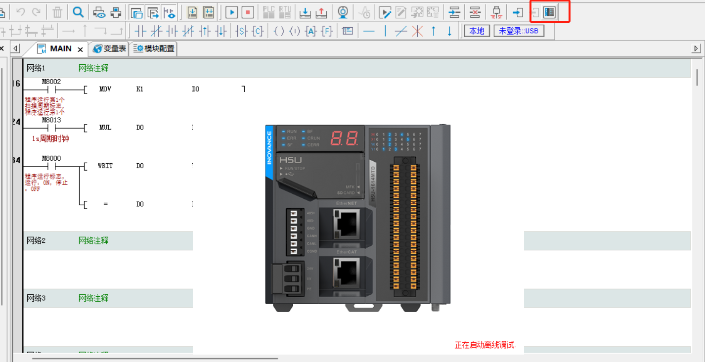 这样威纶通触摸屏就可以与H5U进行通信了,实现双在线仿真功能。