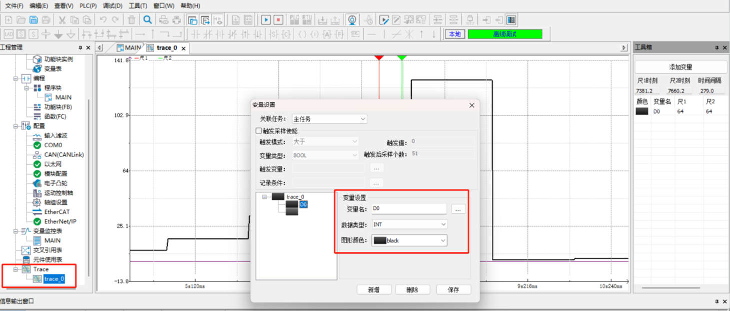 用户可以使用Trace功能,Trace功能类似于数字采样示波器,可以记录变量的历史值。当启动Trace功能时,Autoshop会开始存储包含时间标记的值数据记录。