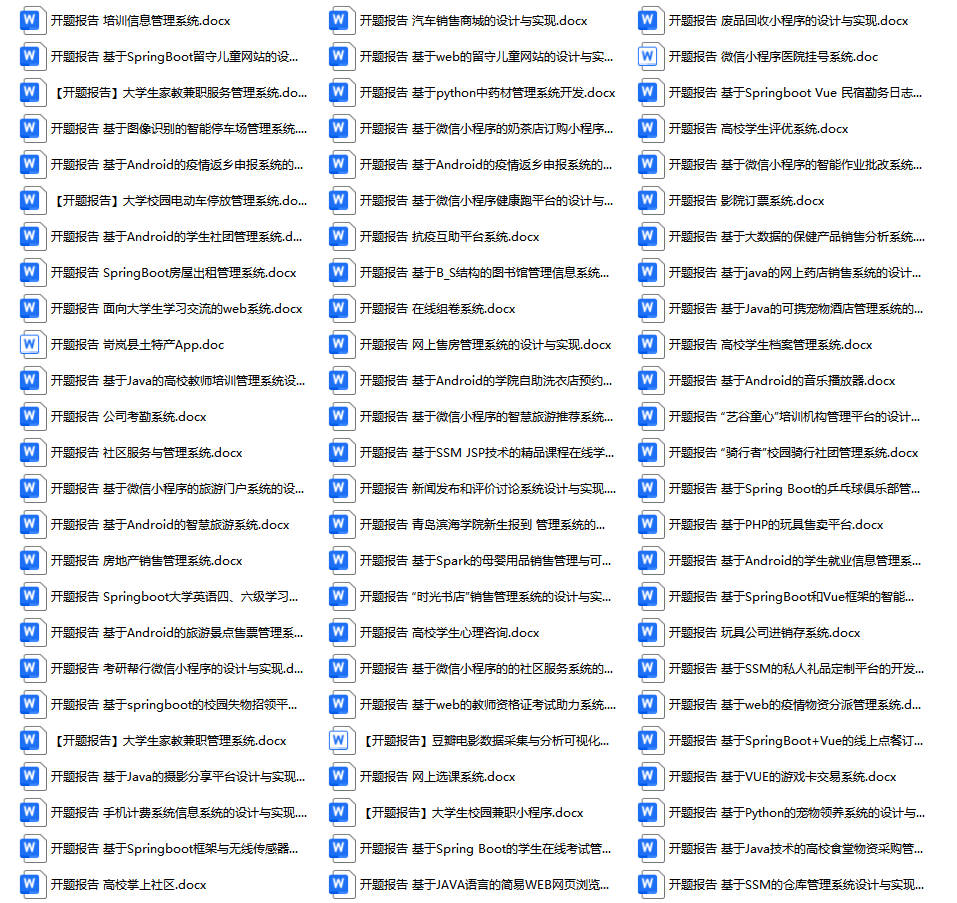 以上是某同学的毕业设计答辩的过程,如果你现在还没有参加答辩,还是开题阶段,已经选好了题目不知道怎么写开题报告,可以下面找找有没有自己符合自己题目的开题报告内容,列表中的开题报告都是往届真实的开题报告,可发送使用或参考。文末或底部来联xi可免费获取