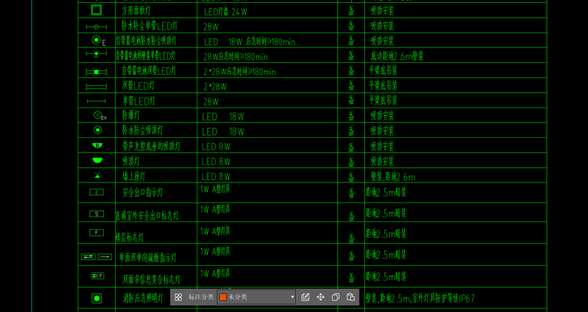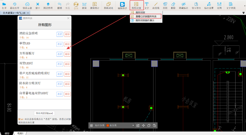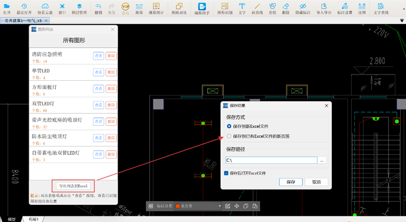 当所有照明灯具识别完成后,【查看已识别图形列表】功能可快速查看全部已识别灯具的工程量;该界面中的【导出列表到Excel】功能可将工程量保存至新建Excel文件或现有文件的新工作表。