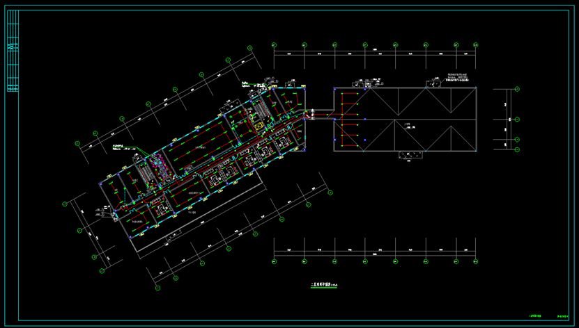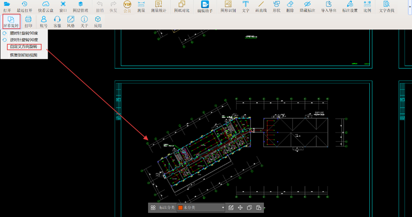 2. 在观察时发现该图纸为异形轴网,其中1-1轴至1-8轴查看极为不便。此时可使用CAD快速看图软件的【屏幕旋转】功能:绘制一条直线作为旋转后的水平方向线,点击左键指定方向线的起点。