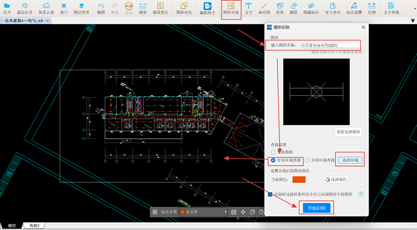 3.以自带蓄电池双管LED灯为例,在CAD快速看图中使用【图形识别】功能,精确框选图例后,在绘图区空白处右键确认。确认无误后在对话框中输入图形名称(如“自带蓄电池双管LED灯”),便于后续查找。设置识别范围时,建议用矩形区域框选整个二层照明平面图,启动自动识别统计,结果显示自带蓄电池双管LED灯工程量为9套。其他照明灯具识别方法同上,不再赘述。