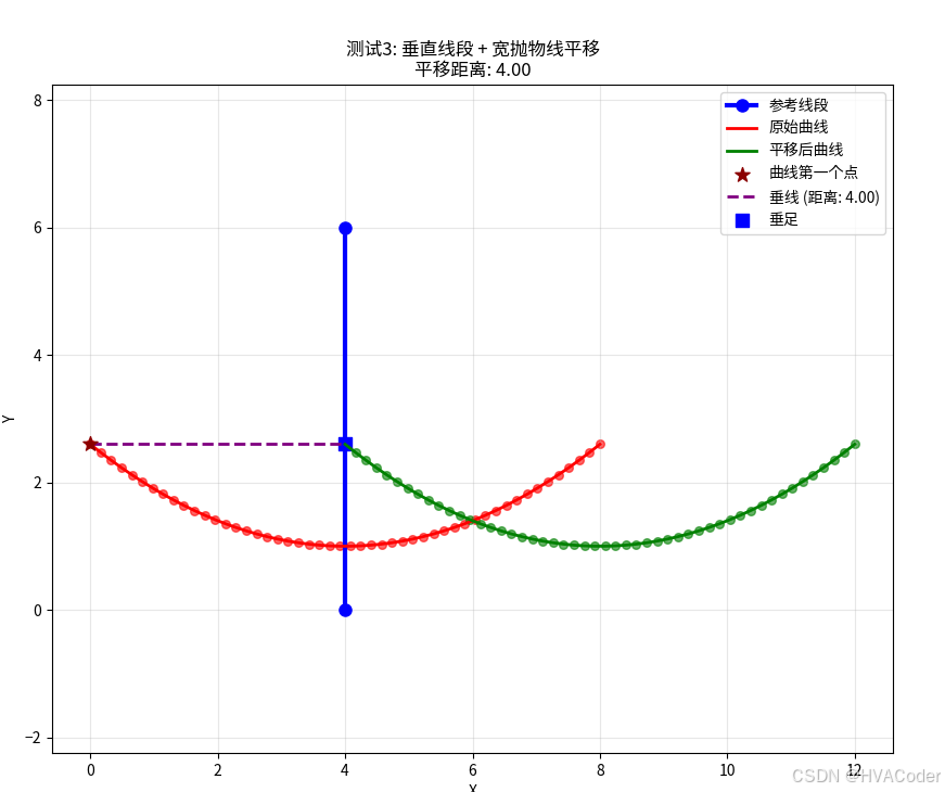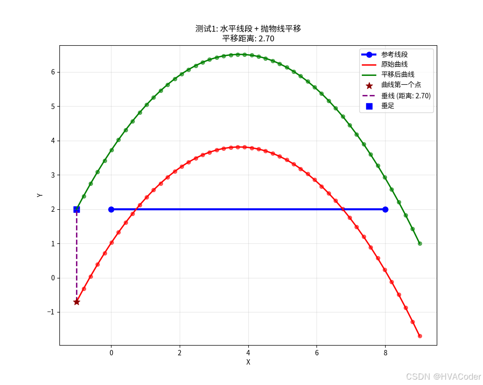 import matplotlib.font_manager as fmdef normalize_vector(v):"""单位化向量"""norm = np.linalg.norm(v)if norm == 0:return vreturn v / normdef point_to_line_distance(point, line_point1, line_point2):"""计算点到直线的距离参数:point: 点的坐标 (x,y)line_point1, line_point2: 直线上的两个点返回:点到直线的距离"""p = np.array(point)p1 = np.array(line_point1)p2 = np.array(line_point2)# 直线方向向量line_dir = p2 - p1line_length = np.linalg.norm(line_dir)if line_length < 1e-10:# 如果线段长度为零,返回点到点的距离return np.linalg.norm(p - p1)# 计算点到直线的距离# 使用向量叉积公式:|(p-p1) × (p2-p1)| / |p2-p1|distance = np.abs(np.cross(p2-p1, p-p1)) / line_lengthreturn distancedef point_to_line_perpendicular_vector(point, line_point1, line_point2):"""计算点到直线的垂线向量返回从点到直线的垂线向量(从点指向直线)"""p = np.array(point)p1 = np.array(line_point1)p2 = np.array(line_point2)# 直线方向向量line_dir = p2 - p1line_length_squared = np.dot(line_dir, line_dir)if line_length_squared < 1e-10:return p1 - p# 计算投影参数 tt = np.dot(p - p1, line_dir) / line_length_squared# 计算垂足坐标foot_point = p1 + t * line_dir# 垂线向量(从点指向垂足)perpendicular_vector = foot_point - preturn perpendicular_vectordef translate_curve_by_first_point_distance(line_points, curve_points):"""将曲线沿着线段的垂线方向平移,平移距离等于曲线第一个点到线段的垂直距离参数:line_points: 线段的两个端点 [(x1,y1), (x2,y2)]curve_points: 曲线的点集 [(x,y), ...]返回:平移后的曲线点集"""if len(curve_points) == 0:return curve_points# 提取线段端点和曲线第一个点p1, p2 = np.array(line_points[0]), np.array(line_points[1])first_point = np.array(curve_points[0])# 计算第一个点到线段的垂线向量perp_vector = point_to_line_perpendicular_vector(first_point, p1, p2)# 计算垂线距离(平移距离)distance = np.linalg.norm(perp_vector)# 计算垂线方向单位向量if distance > 1e-10:unit_perp = perp_vector / distanceelse:# 如果点在直线上,使用法线方向line_dir = p2 - p1unit_perp = normalize_vector(np.array([line_dir[1], -line_dir[0]]))# 平移所有曲线点translated_points = []for point in curve_points:new_point = np.array(point) + unit_perp * distancetranslated_points.append(new_point)return np.array(translated_points), distancedef create_parabola(a, b, c, x_range, num_points=50):"""创建抛物线点集"""x = np.linspace(x_range[0], x_range[1], num_points)y = a * x**2 + b * x + creturn list(zip(x, y))# 可视化函数