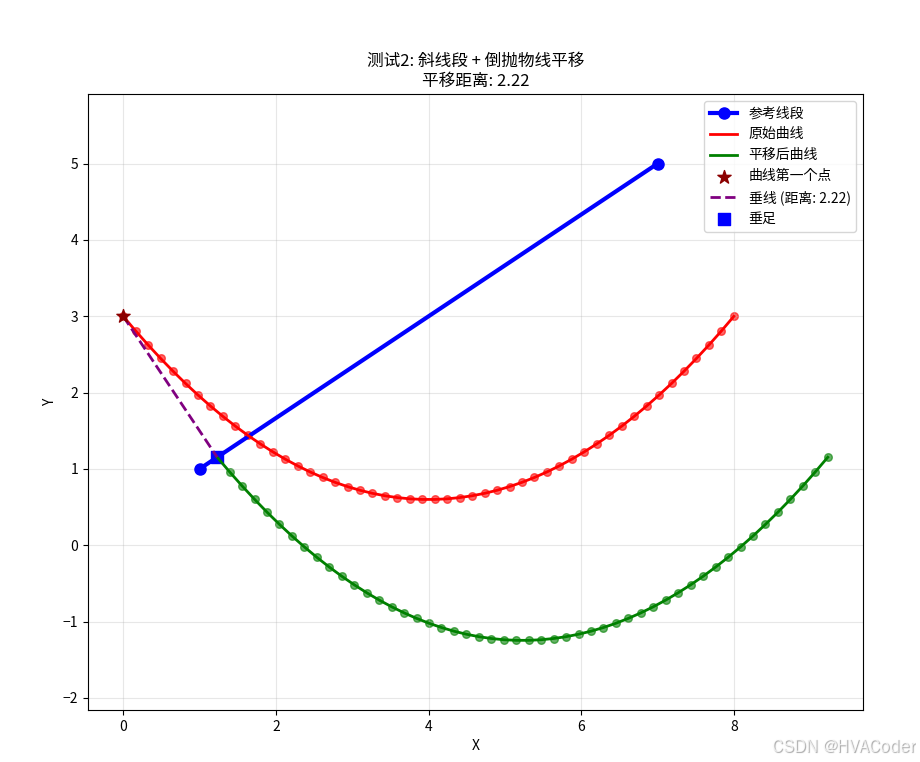 def plot_translation_result(line_points, original_curve, translated_curve, distance, title):"""绘制平移结果"""plt.figure(figsize=(10, 8))chinese_fonts = [f.name for f in fm.fontManager.ttflist if 'CJK' in f.name or 'Hei' in f.name or 'YaHei' in f.name]print("可用的中文字体:", chinese_fonts)# 如果有可用中文字体,使用第一个if chinese_fonts:plt.rcParams['font.sans-serif'] = [chinese_fonts[0], 'DejaVu Sans']else:print("未找到中文字体,需要安装")# 绘制原始线段line_x = [line_points[0][0], line_points[1][0]]line_y = [line_points[0][1], line_points[1][1]]plt.plot(line_x, line_y, 'b-', linewidth=3, label='参考线段', marker='o', markersize=8)# 绘制原始曲线orig_x, orig_y = zip(*original_curve)plt.plot(orig_x, orig_y, 'red', linewidth=2, label='原始曲线')plt.scatter(orig_x, orig_y, c='red', s=30, alpha=0.6)# 绘制平移后的曲线trans_x, trans_y = zip(*translated_curve)plt.plot(trans_x, trans_y, 'green', linewidth=2, label='平移后曲线')plt.scatter(trans_x, trans_y, c='green', s=30, alpha=0.6)# 标记第一个点并绘制垂线first_point = original_curve[0]plt.scatter(first_point[0], first_point[1], c='darkred', s=100, marker='*', label='曲线第一个点', zorder=5)# 计算垂足p1, p2 = np.array(line_points[0]), np.array(line_points[1])first_pt = np.array(first_point)line_dir = p2 - p1t = np.dot(first_pt - p1, line_dir) / np.dot(line_dir, line_dir)foot_point = p1 + t * line_dir# 绘制垂线plt.plot([first_point[0], foot_point[0]], [first_point[1], foot_point[1]], 'purple', linestyle='--', linewidth=2, label=f'垂线 (距离: {distance:.2f})')plt.scatter(foot_point[0], foot_point[1], c='blue', s=80, marker='s', label='垂足')plt.grid(True, alpha=0.3)plt.axis('equal')plt.legend()plt.title(f'{title}\n平移距离: {distance:.2f}')plt.xlabel('X')plt.ylabel('Y')plt.show()# 示例使用