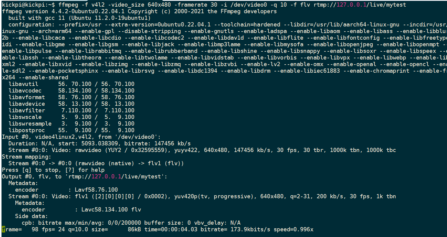 ffmpeg -f v4l2 -video_size 640x480 -framerate 30 -i /dev/video0 -q 10 -f flv rtmp://127.0.0.1/live/mytest
