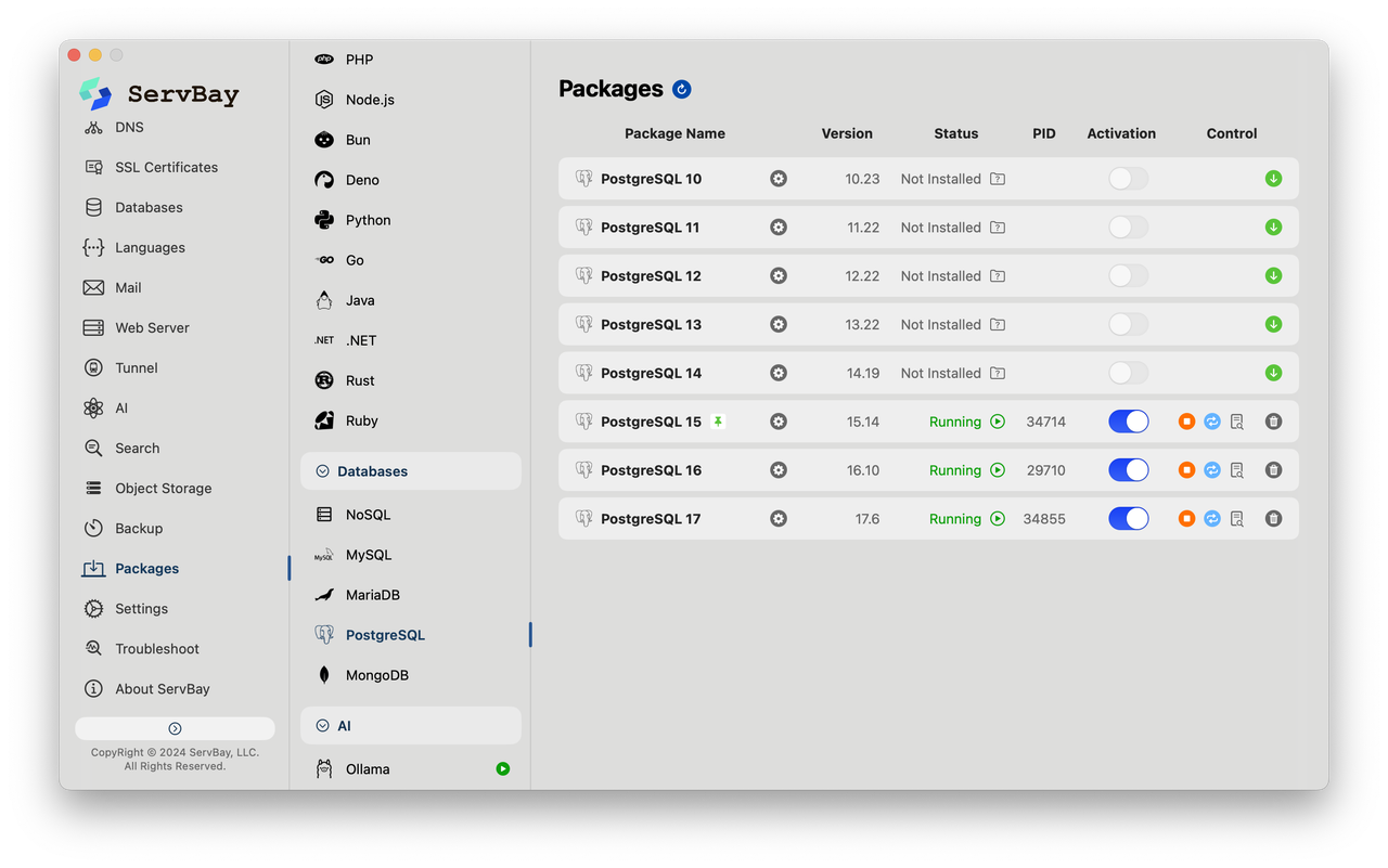 做出选择的关键在于清晰地认识项目需求。而借助ServBay这样的现代化开发工具,一键安装MySQL和PostgreSQL,并且还能支持多个数据库实例同时运行,你可以更自由地去探索、去验证,最终为项目找到最合适的引擎。
