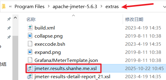 7、添加配置文件jmeter.results.shanhe.me.xsl到extras目录下,该文件为报告提供模板,如果你的jmeter跟我一样没有这个文件(jmeter/extras下检查下有没有),那么可以新建一个文件,名字就是上边的
