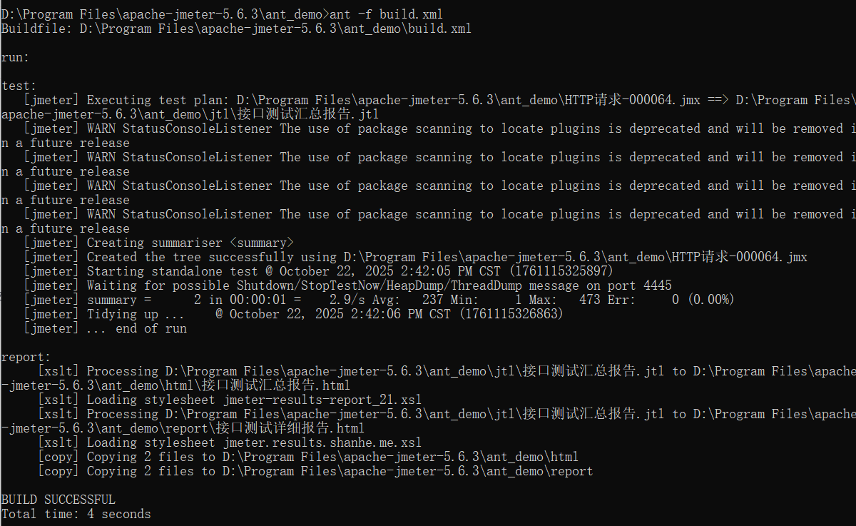 </tstamp><!--需要调用的jmeter目录,根据需要进行修改,本次使用的Windows路径--><property name="jmeter.home" value="D:\Program Files\apache-jmeter-5.6.3" /><property name="report.title" value="接口性能测试"/><!-- jmeter生成jtl格式的结果报告的路径--><property name="jmeter.result.jtl.dir" value="D:\Program Files\apache-jmeter-5.6.3\ant_demo\jtl" /><!-- jmeter生成html格式的结果报告的路径--><property name="jmeter.result.html.dir" value="D:\Program Files\apache-jmeter-5.6.3\ant_demo\html" /><!-- 【详细报告】jmeter生成html格式的详细报告的路径--><property name="jmeter.result.html.dir1" value="report" /><!--生成的报告的前缀--><property name="ReportName" value="接口测试汇总报告" /><property name="ReportName1" value="接口测试详细报告" /><property name="jmeter.result.jtlName" value="${jmeter.result.jtl.dir}/${ReportName}.jtl" /><property name="jmeter.result.htmlName" value="${jmeter.result.html.dir}/${ReportName}.html" /><!-- 【详细报告】详细报告的文件名--><property name="jmeter.result.htmlName1" value="${jmeter.result.html.dir1}/${ReportName1}.html" /><target name="run" ><!--antcall target-"delete" /--><antcall target="test" /><antcall target="report" /></target><target name="test"><taskdef name="jmeter" classname="org.programmerplanet.ant.taskdefs.jmeter.JMeterTask" /><jmeter jmeterhome="${jmeter.home}" resultlog="${jmeter.result.jtlName}"><!-- 声明要运行的脚本路径"*.jmx"指包含此目录下的所有jmeter脚本--><testplans dir="D:\Program Files\apache-jmeter-5.6.3\ant_demo" includes="*.jmx" /><property name="jmeter.save.saveservice.output_format" value="xml"/></jmeter></target><path id="xslt.classpath"><fileset dir="${jmeter.home}/lib" includes="xalan*.jar"/><fileset dir="${jmeter.home}/lib" includes="serializer*.jar"/></path><!--该命令为生成汇总和详细报告--><target name="report"><tstamp><format property="report.datestamp" pattern="yyy/MM/dd HH:mm" /></tstamp><xsltclasspathref="xslt.classpath"force="true"in="${jmeter.result.jtlName}"out="${jmeter.result.htmlName}"style="${jmeter.home}/extras/jmeter-results-report_21.xsl"><param name="dateReport" expression="${report.datestamp}"/></xslt><!--【详细报告】指定详细报告模板文件--><xslt classpathref="xslt.classpath"force="true"in="${jmeter.result.jtlName}"out="${jmeter.result.htmlName1}"style="${jmeter.home}/extras/jmeter.results.shanhe.me.xsl"><param name="dateReport" expression="$report.datestamp"/></xslt><!--因为上面生成报告的时候,不会将相关的图片也一起拷贝至日标目录,所以,需要手动拷贝--><copy todir="${jmeter.result.html.dir}"><fileset dir="${jmeter.home}/extras"><include name="collapse.png" /><include name="expand.png" /></fileset></copy><!-- 【详细报告】拷贝图片到目标日录--><copy todir="${jmeter.result.html.dir1}"><fileset dir="${jmeter.home}/extras"><include name="collapse.png" /><include name="expand.png" /></fileset></copy></target>