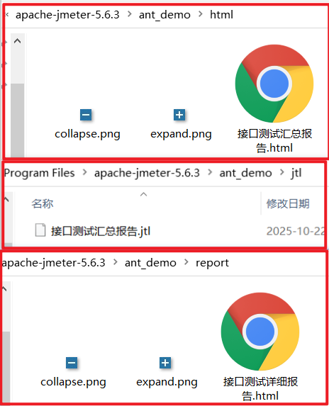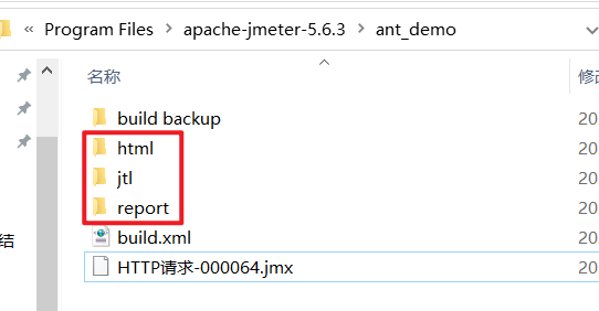 11、运行成功后会在ant_demo目录下生成三个文件夹:html、jtl、report,这就是我们上边提到的build.xml文件配置的内容(里边都有注释,此处不再赘述)