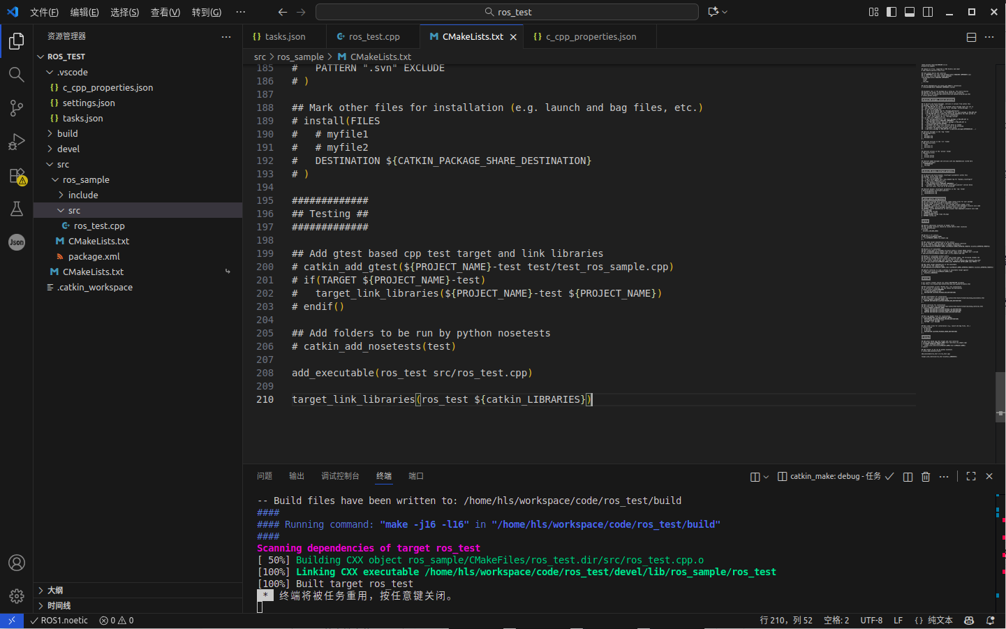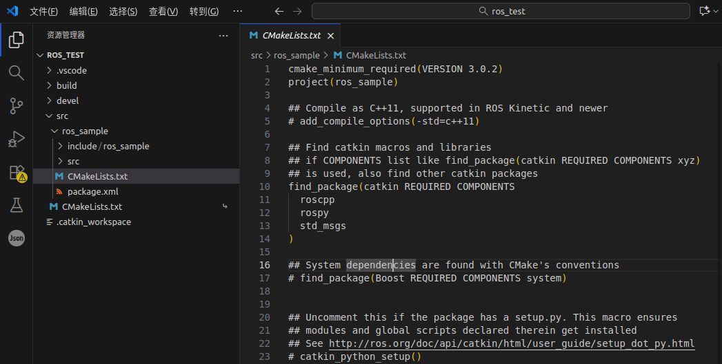 这里ros_sample是自定义包名,ros_test是对应的节点。