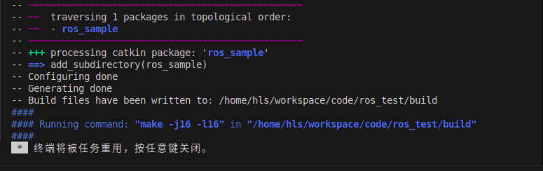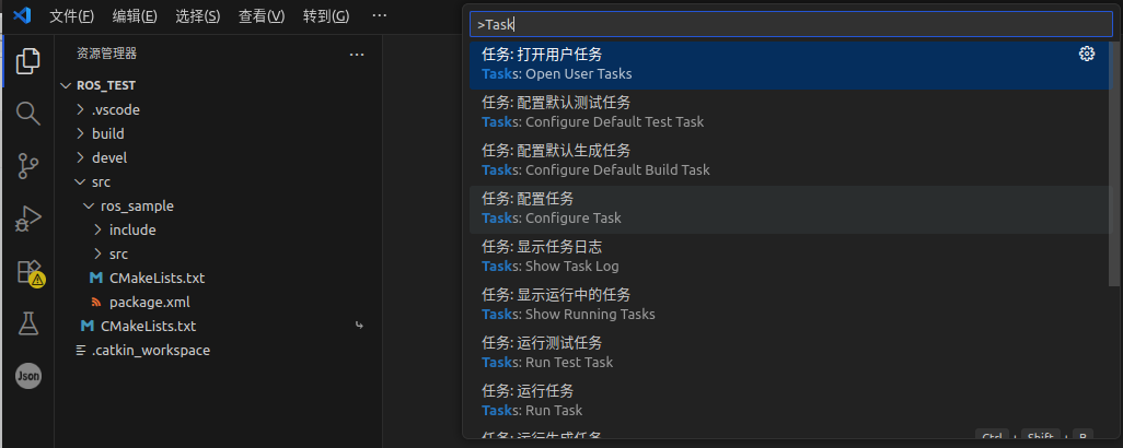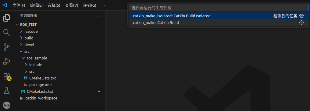 按ctrl+shift+b,选择catkin_make:Catkin Build,查看是否编译通过。