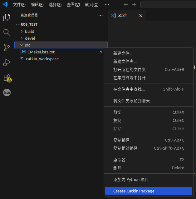 注意:这里一定要在src、devel、build同级目录下打开vscode.