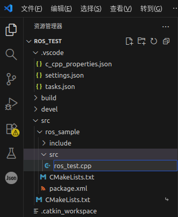 在ros_test/src/ros_sample/src下新建文件ros_test.cpp,并写入以下代码:
