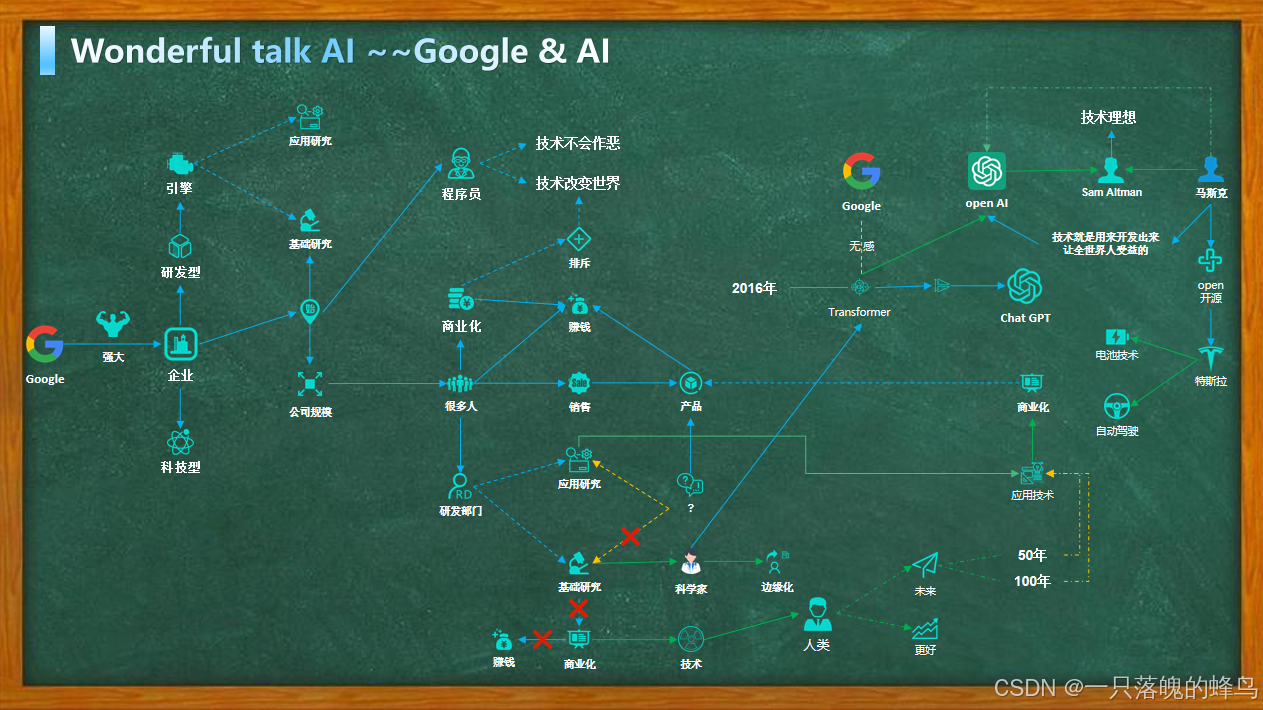 2016年他们写出了跨世界的Transformer这一系列的论文(是现在Chat GPT模型的基础)但是在Google内部没有什么声响,这是有个年轻人叫做Sam Altman(Open AI)对吧,Sam是有技术理想的,他得到了马斯克的支持,所以最开始其实Open AI这个名字都是马斯克起的,叫做“开源的技术”开源的系统叫Open,是马斯克的作风,你看他现在把特斯拉汽车的电池技术,自动驾驶技术都是开源的。因为他认为技术就是用来开发出来让全世界人受益的,当然Open AI其实也是如此啊。
