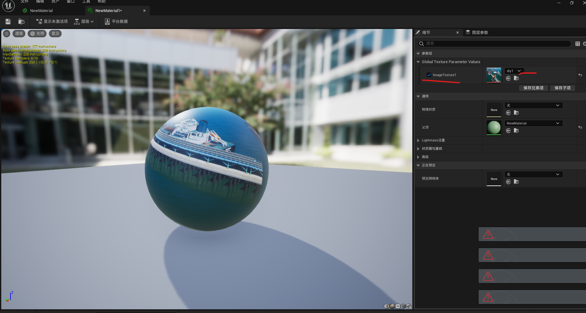(2)双击新创建的材质实例进人材质测编辑器。在右侧的细节面板中,把参数“imageTexture1”左侧的选项打上钩,表示启用这个参数,然后就会发现这个参数由暗变亮。参数亮了之后,单击参数对应的下拉框,输入“diy”来选中diy图片的纹理。