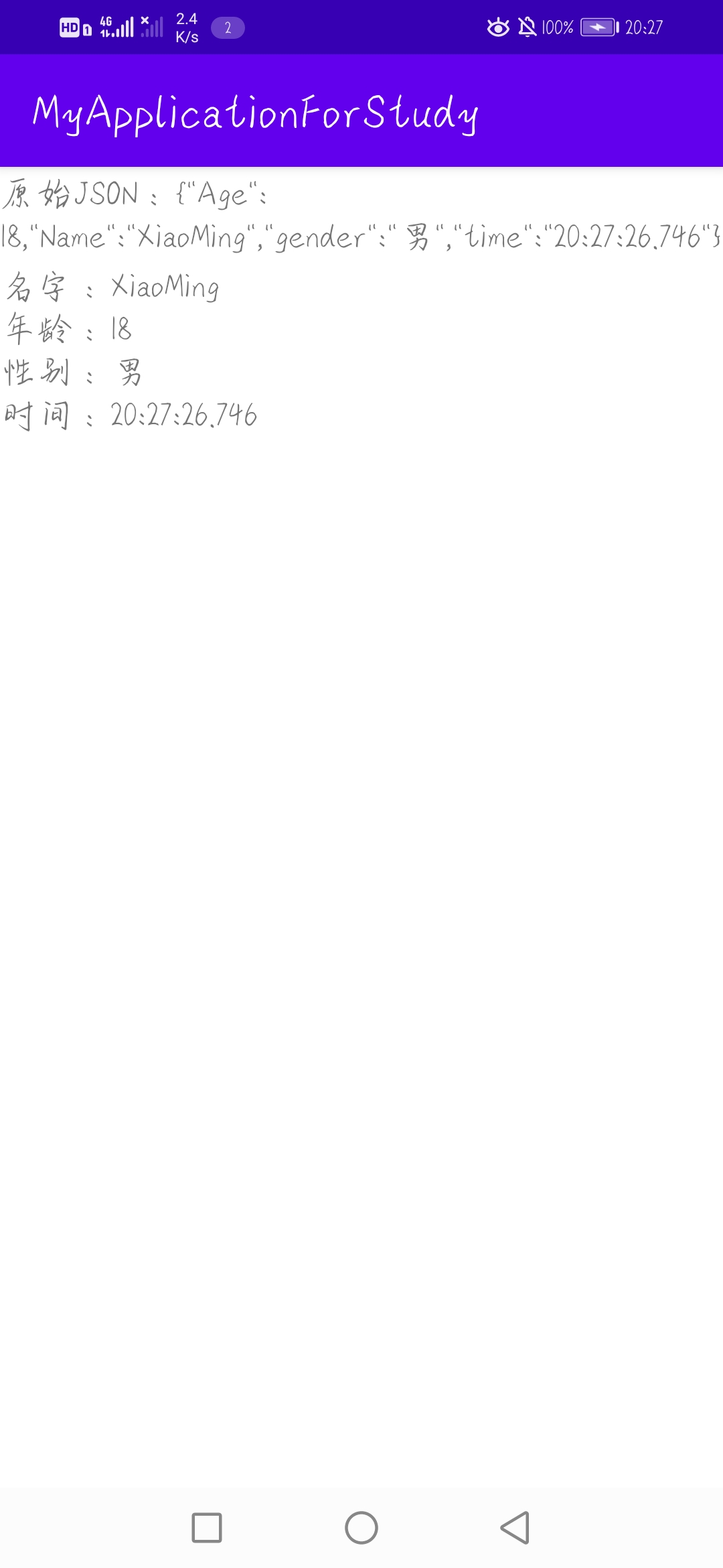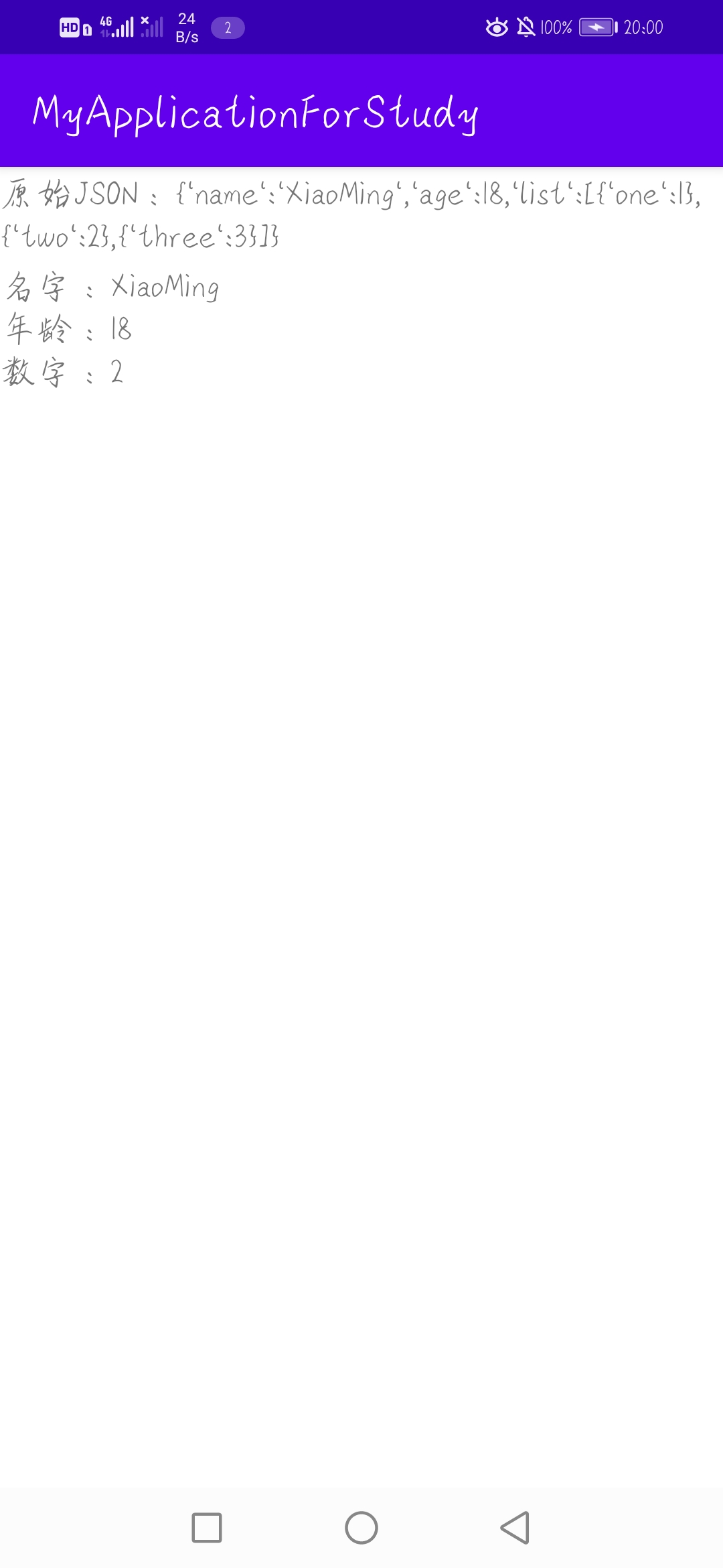 public class JsonAnalyzeActivity extends AppCompatActivity {private final String TAG = "JsonAnalyzeActivity";@Overrideprotected void onCreate(Bundle savedInstanceState) {super.onCreate(savedInstanceState);setContentView(R.layout.activity_json_analyze);TextView textView_1,textView_2;textView_1 = findViewById(R.id.textView_1);textView_2 = findViewById(R.id.textView_2);String json = "{'name':'XiaoMing','age':18,'list':[{'one':1},{'two':2},{'three':3}]}";try {JSONObject jsonObject = new JSONObject(json);textView_1.setText("原始JSON:" + json);textView_2.setText(String.format("名字:%s\n年龄:%s\n数字:%d",jsonObject.getString("name"),jsonObject.getInt("age"),jsonObject.getJSONArray("list").getJSONObject(1).getInt("two")));}catch (Exception e){Log.d(TAG,e.getMessage());}}