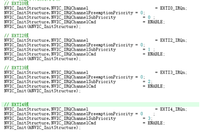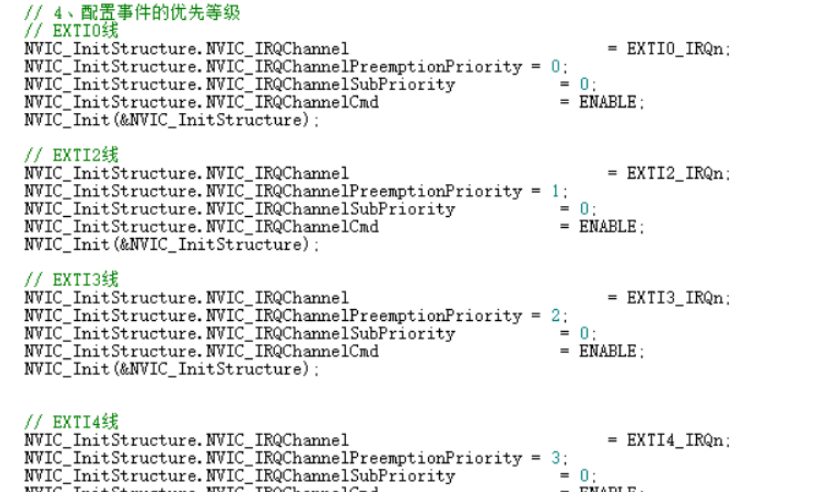 如果将EXTIx_IRQN设置为 EXTI0_IRQN 0、0; EXTI2_IRQN 0、1; EXTI3_IRQN 0、2; EXTI4_IRQN 0、3;为后从key4-key1反按LED4先亮,随后LED1亮LED2、LED3亮起,可以看出抢占优先级高EXTI0_IRQN、 EXTI2_IRQN先执行。即使响应优先级在内部优先级分组占1个bits,但设置EXTI3_IRQN 、 EXTI4_IRQN抢占优先级相同,没有响应优先级时按照硬件优先级执行。