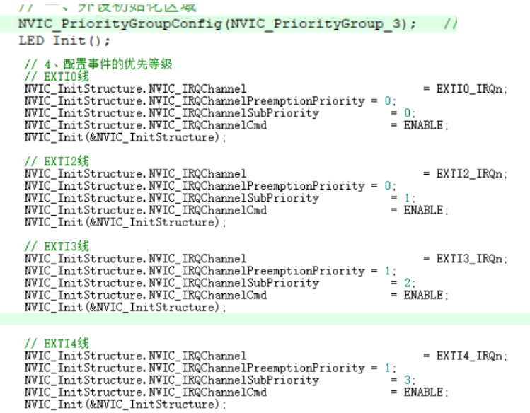将将NVIC_PriorityGroupConfig( ); 设置为NVIC_PriorityGroup_4当前EXTIX_IRQN抢占和响应设与置NVIC_PriorityGroupConfig( )为NVIC_PriorityGroup_3一致会发现 从key4-key1反按LED2先亮,随后LED1亮,LED4、LED3亮起。执行顺序的 EXTI4_IRQN被EXTI0_IRQN、 EXTI2_IRQN抢占,由于EXTI2_IRQN先抢占已经在执行了所以即使EXTI0_IRQN的响应优先级比EXTI2_IRQN的高也是先执行EXTI2_IRQN中断才是EXTI0_IRQN,之后返回EXTI4_IRQN执行,之后执行EXTI3_IRQN。