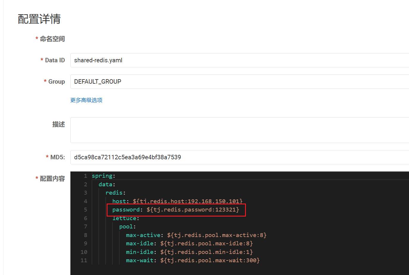同理到nacos的配置去查看redis的密码(我看了一下这次的密码倒是和之前的一样都是123321)