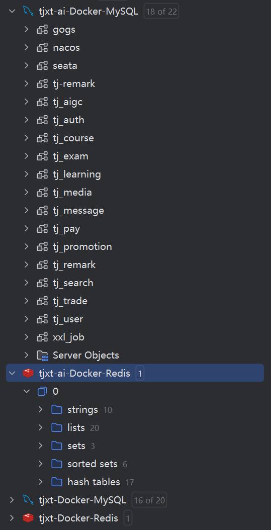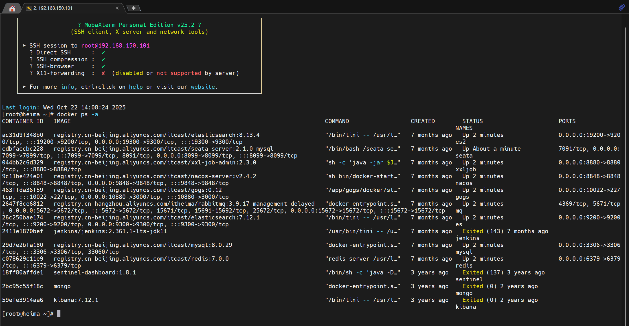 打开MobaXterm软件,一开始我还怕同一个ip地址连接会不会出问题,实际上大家完全不用害怕。虽然是同一个ip地址,但是你实际开哪个虚拟机连接显示就是哪个虚拟机的容器,不是同时开tjxt-init和tjxt-ai就不会冲突,下图就是新的docker容器,很显然少了之前的一些服务(因为到天机ai项目直接就是在IDEA本地启动全部服务了,所以看文档配置也能看到jekins被划掉了)