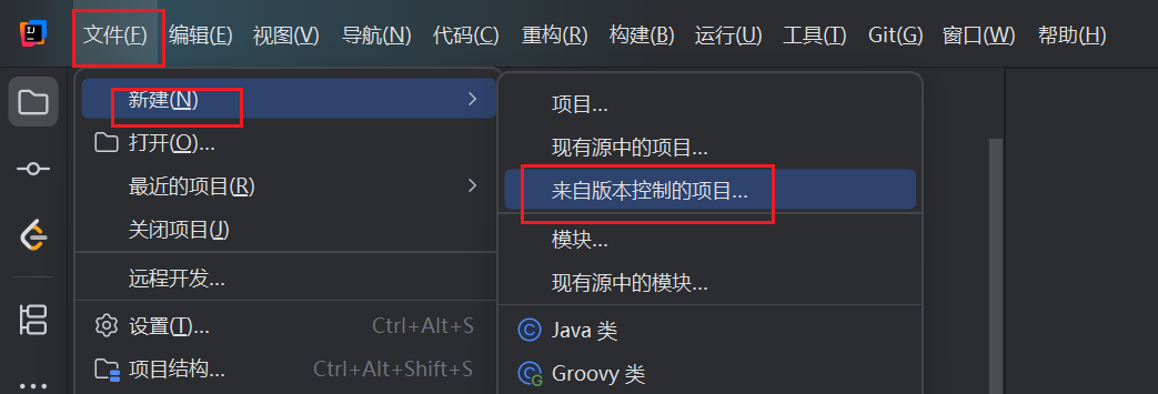 打开IDEA,点击左上角的文件,依次点击新建、来自版本控制的项目