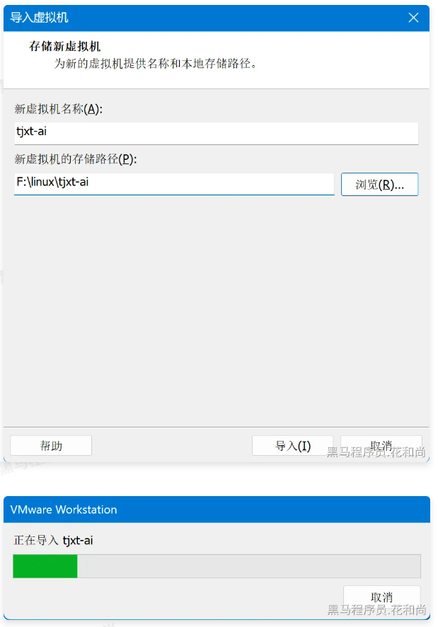 出现导入虚拟机的界面,我这里命名也是tjxt-ai,不过存储路径我还是放到自己的文件夹下。点击导入之后等待即可,导入还是要一点时间的,大概几分钟等一下就行