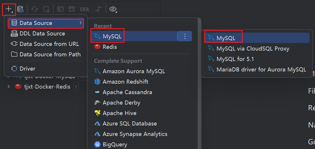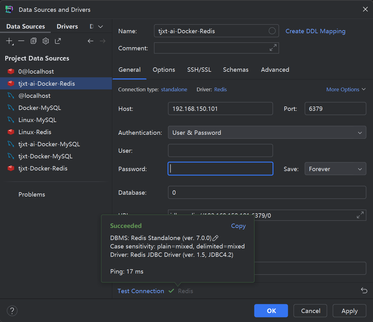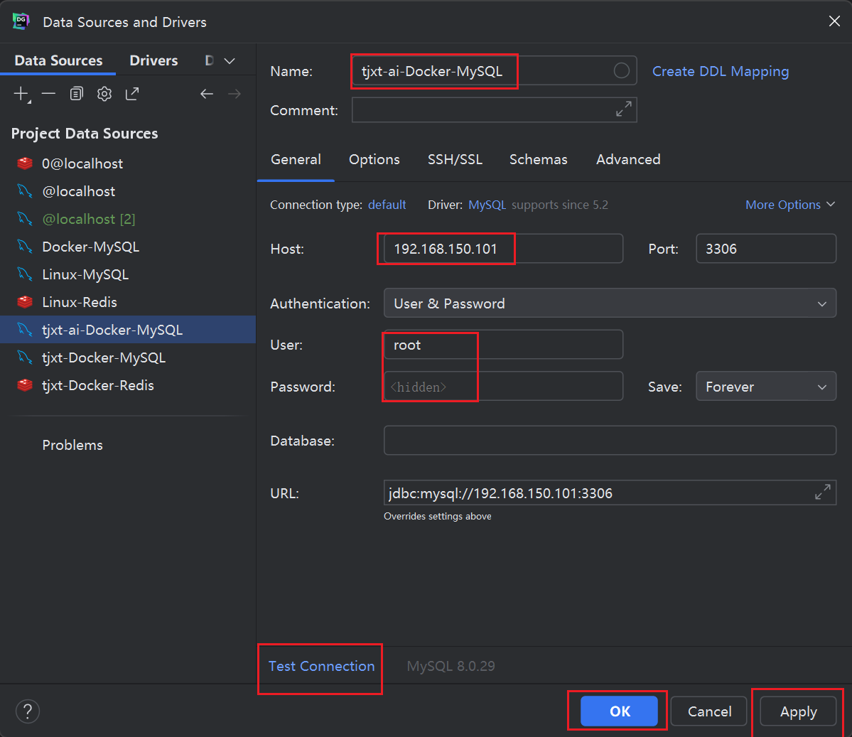 如下图,名字记得与之前的不一样(我之前是tjxt-Docker-MySQL),然后我一开始以为密码和之前一样的,结果发现不是(之前是root-123),密码我们可以打开nacos查看为itcast321bca。输入之后点击Test Connection,成功就点击Apply再点击OK