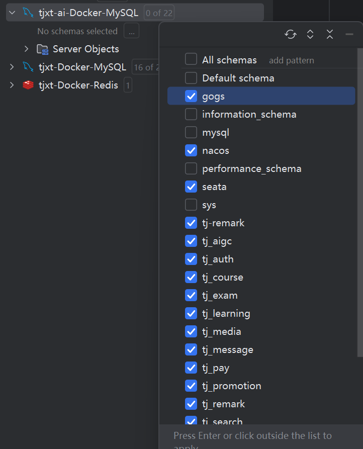 然后再勾选一下schema,不勾选mysql自带的那四个即可
