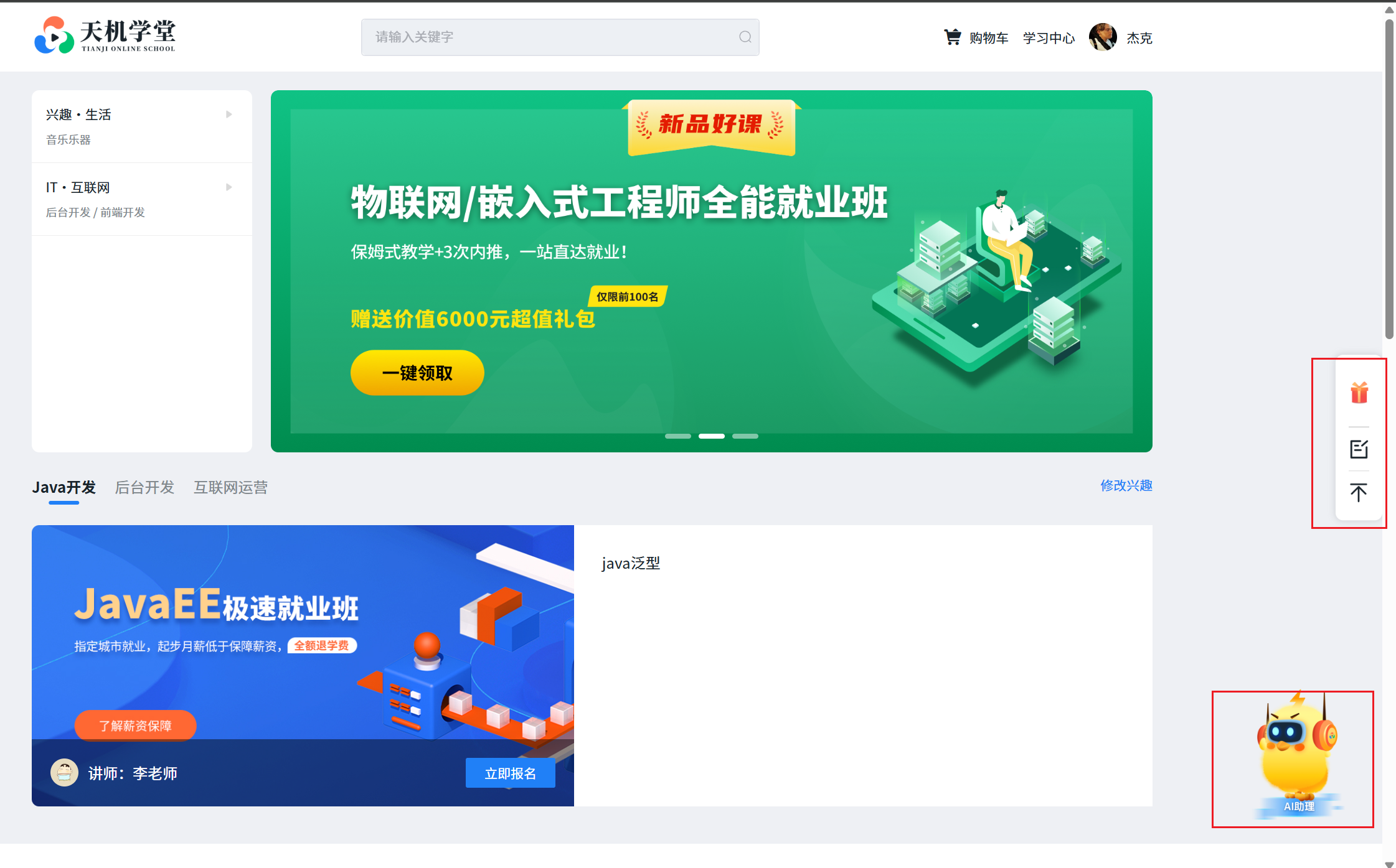 打开用户端前端,使用jack-123456登录(这里账号密码和之前不一样,之前是jack-123),能登录成功就没有问题。登录成功之后也可以看到前端页面和之前不一样,右边出现了白色边框把原来的优惠券礼品盒放到这里了,而右下角就出现了天机AI助手的图标