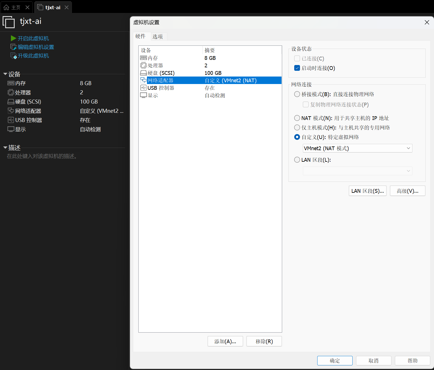 然后这里我导入tjxt-ai之后发现得在下图设备下面的网络适配器那里修改为自定义的VMnet2