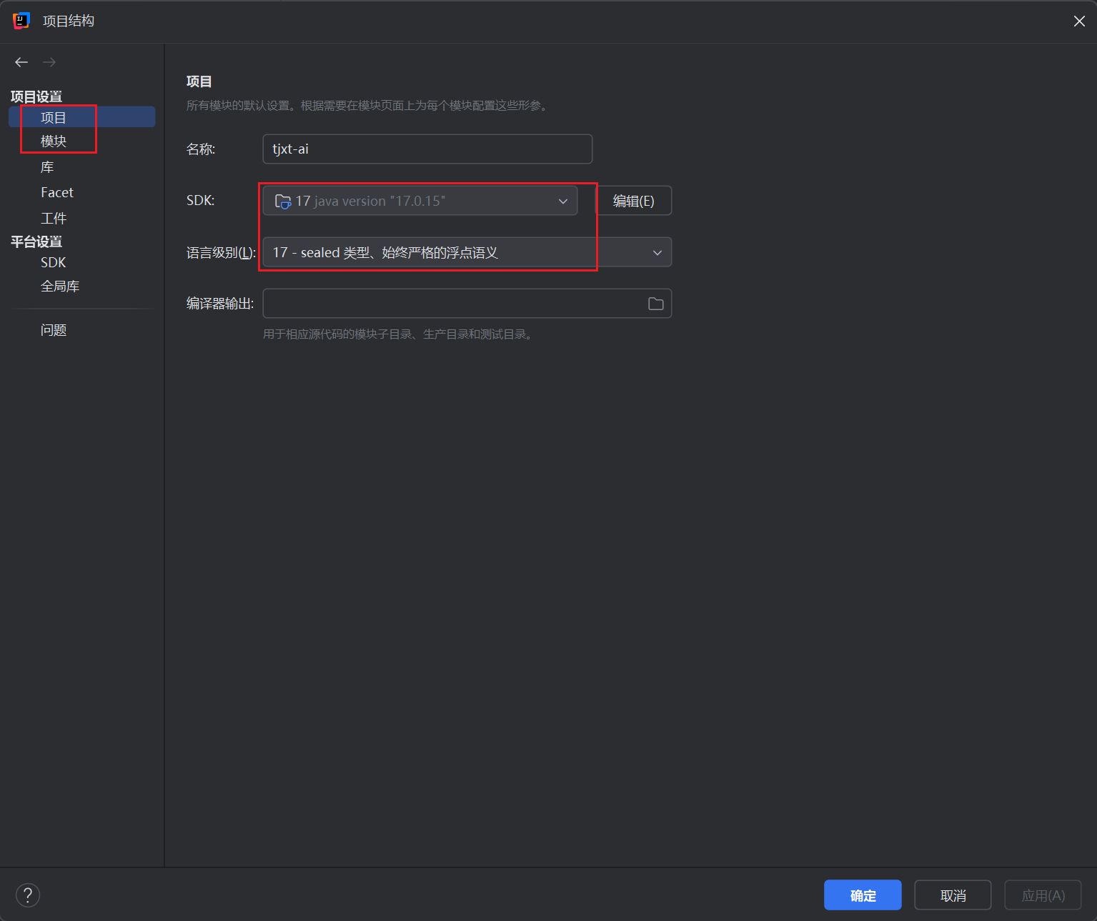 把项目的SDK改为17(没有就下载一个),然后下面语言类型要么就是选SKD默认值要么就是也是选17。然后的话我之前每次都是点进模块再把模块SDK给该了,我之前都不知道,今天试了试才知道其实项目改了之后点击应用并确定就会自动修改模块的SDK