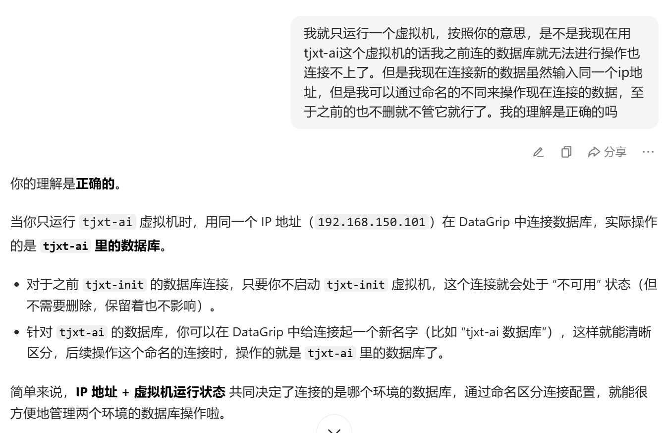 一开始我也是怕同一个ip地址连接数据库会不会出问题,拷打了一下ai发现其实是没事的,启动哪个虚拟机就操作哪个数据库(命名不同就行)