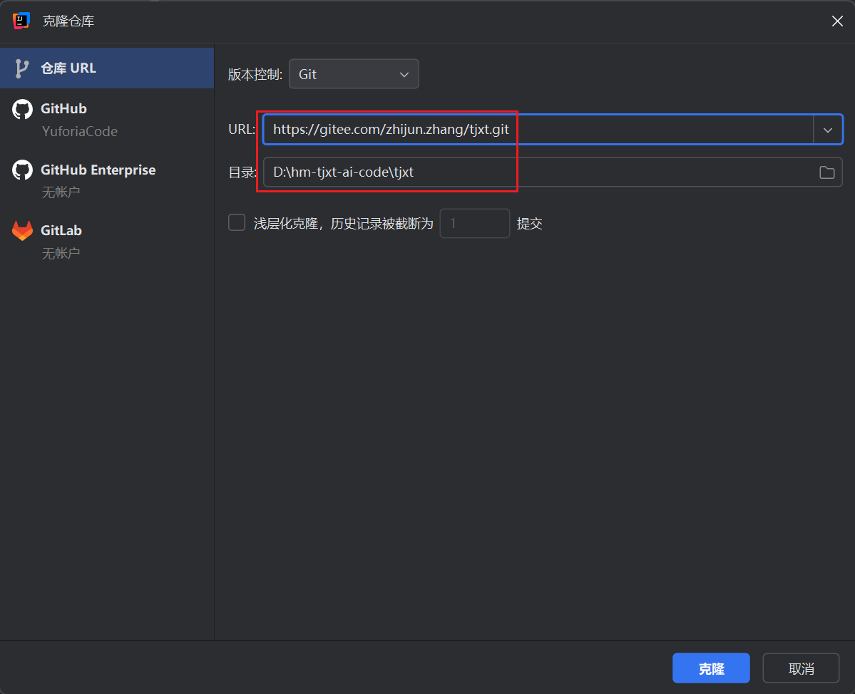 然后URL输入在线文档的地址:https://gitee.com/zhijun.zhang/tjxt.git,下面的目录自己想放哪里就放哪里