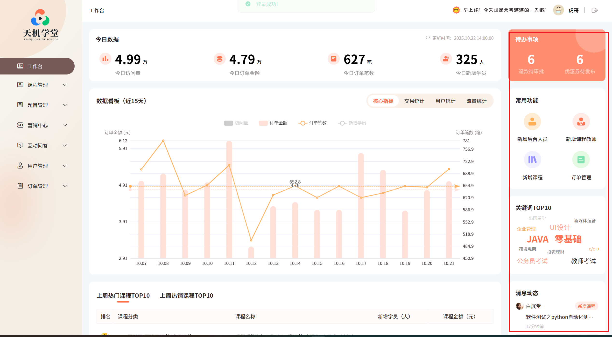 再打开管理端看看,发现密码也变了,现在是13500010002-123456,原来的账号这个一致,但是密码是admin。能登录成功就测试通过了。可以看到管理端右边的这部分也是新增的。到此,天机AI项目的基本导入部署就完成,后续就是跟着文档学习开发了