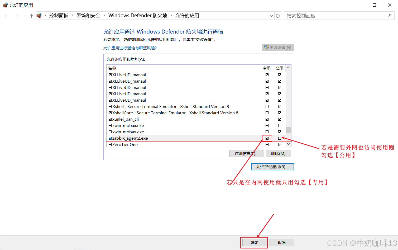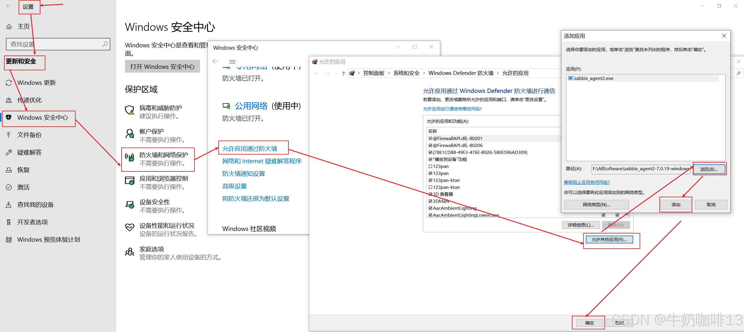 最后就是需要检查防火墙,添加放行规则,打开windows防火墙,添加zabbix-agent2应用:进入【设置】-->【隐私与安全】-->【Windows安全中心】-->【防火墙和网络保护】-->【允许应用通过防火墙】-->【浏览选择zabbix_agent2.exe文件】-->【添加】-->【确定】详细操作如下图所示: