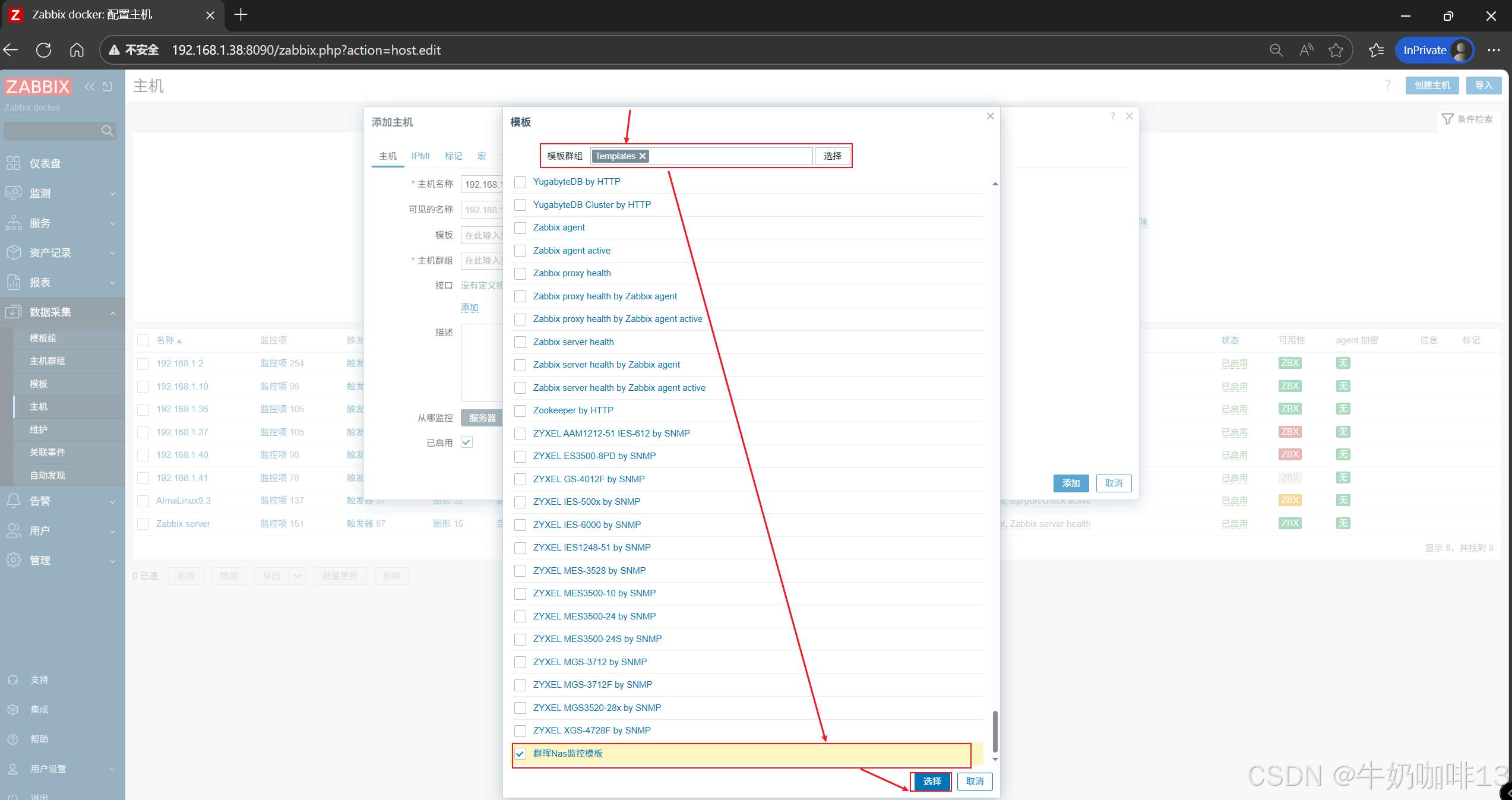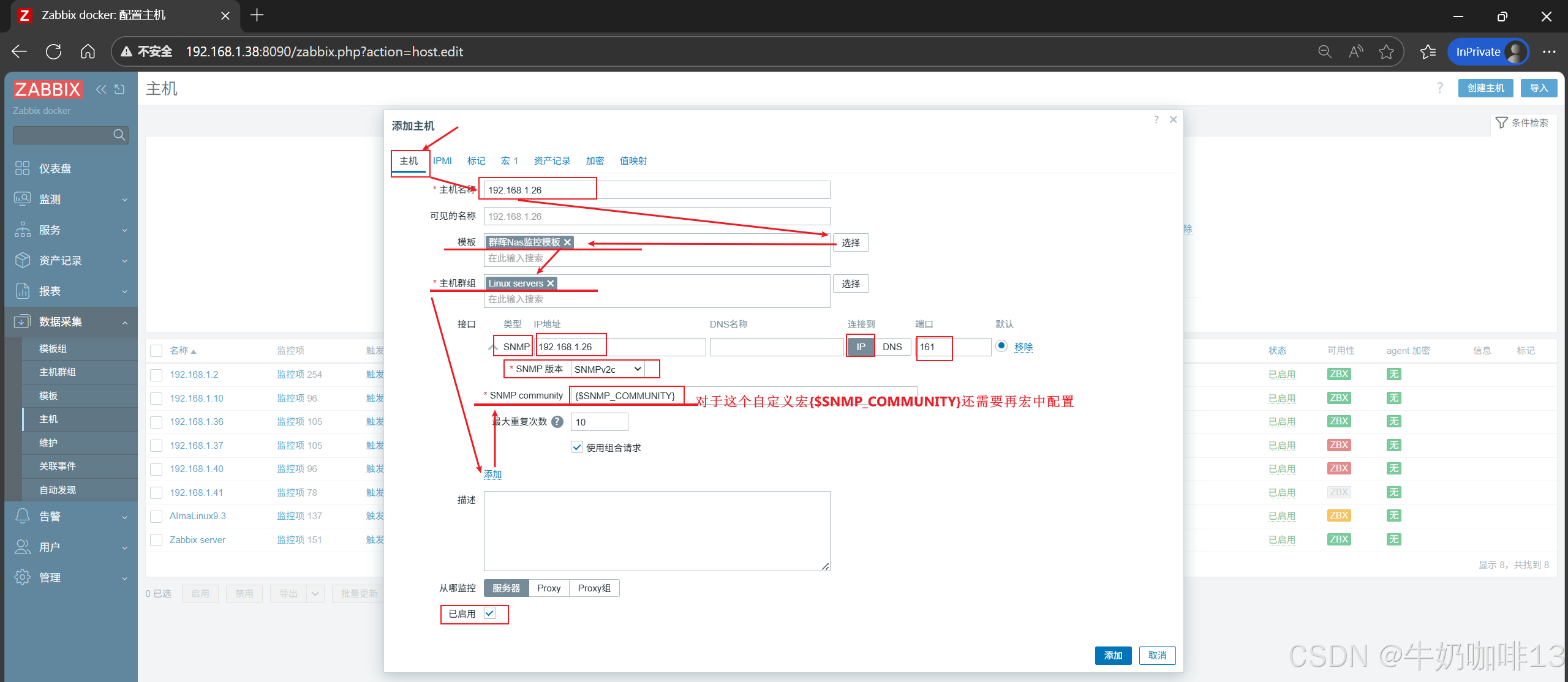 打开zabbix的web界面选择左侧导航栏的【数据采集】-->【主机】-->【创建主机】在弹窗中根据提示填写群晖主机的名称(即:群晖NAS的IP、群晖Nas监控模板、主机组)【注意:SNMP协议只能是被动模式(即:只能是zabbix-server主动去拉取SNMP设备上的数据信息)】。