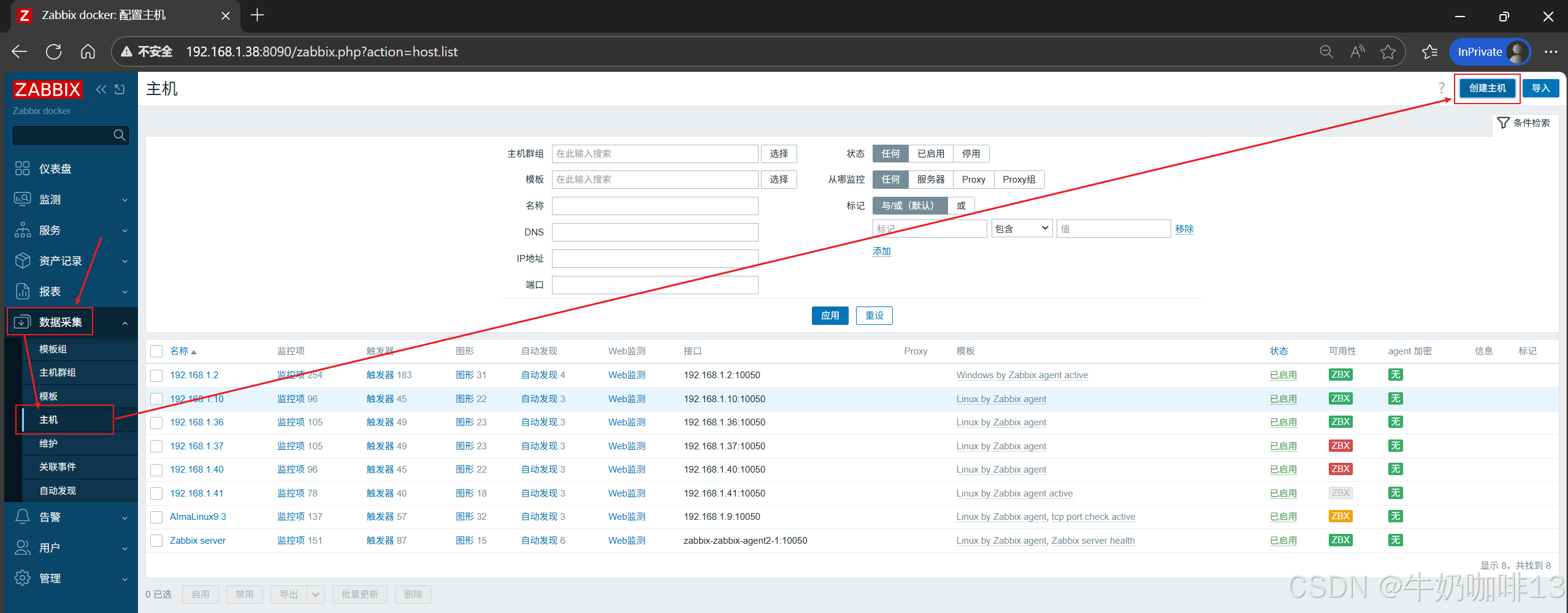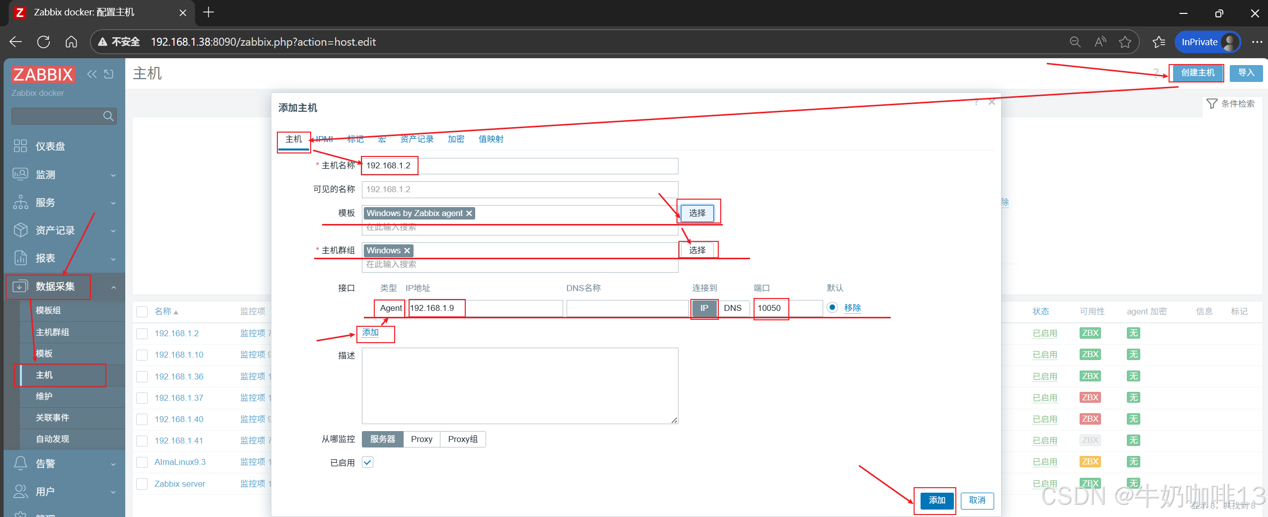 打开zabbix的web网页点击导航栏左侧的【数据采集】-->【主机】-->【创建主机】-->【输入主机的名称、模板、主机群组、添加agent接口信息】-->【添加】即可。