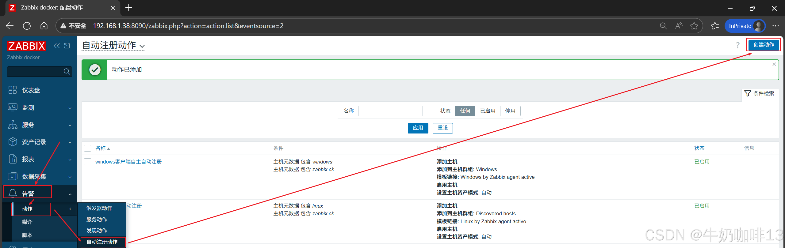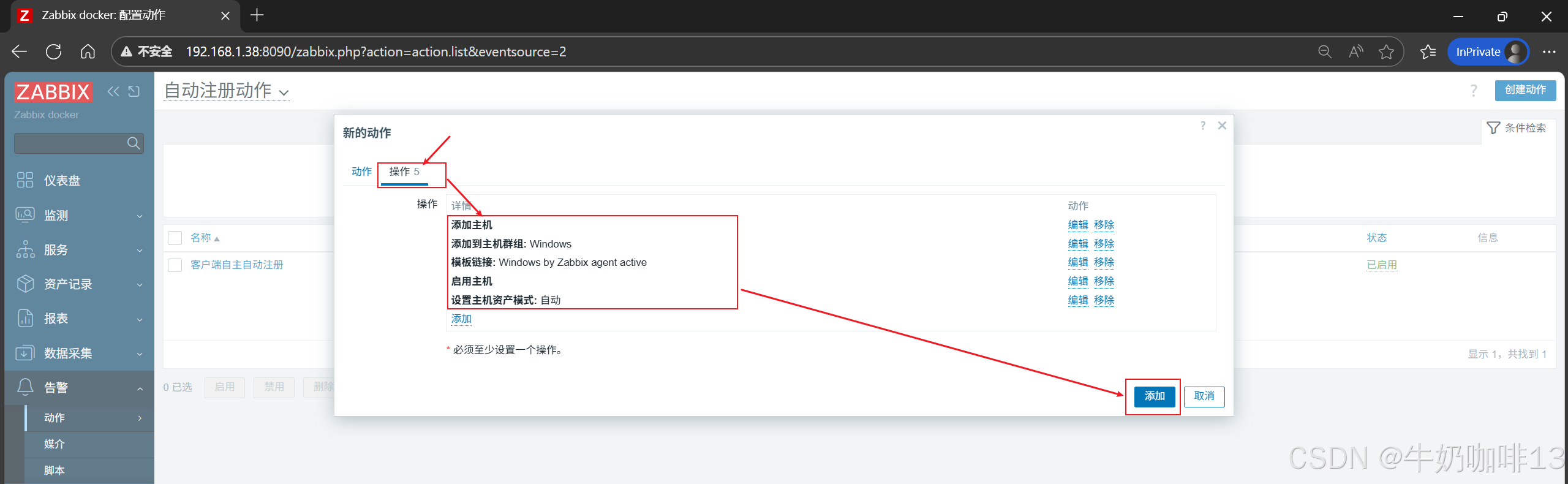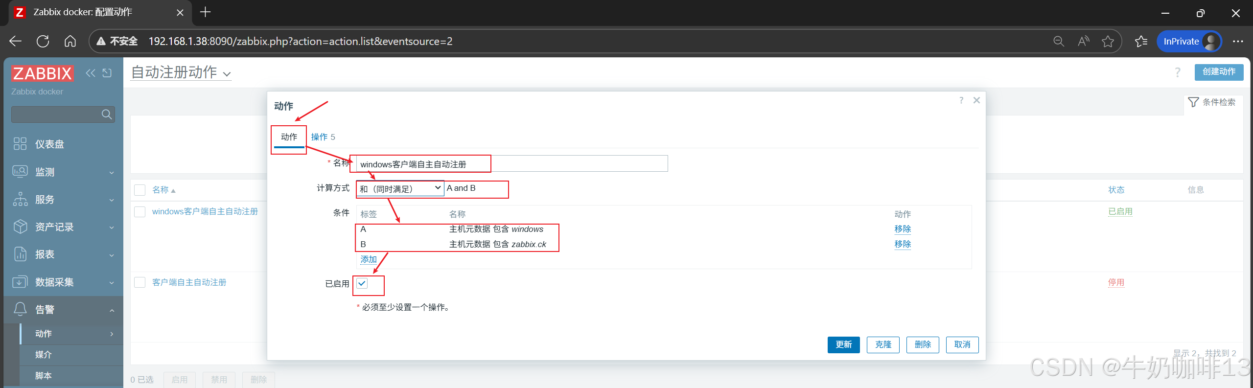 打开zabbix的web网页点击导航栏左侧的【告警】-->【动作】-->【自动注册动作】-->【创建动作】在弹窗的详细配置界面中需要配置如下两个内容: