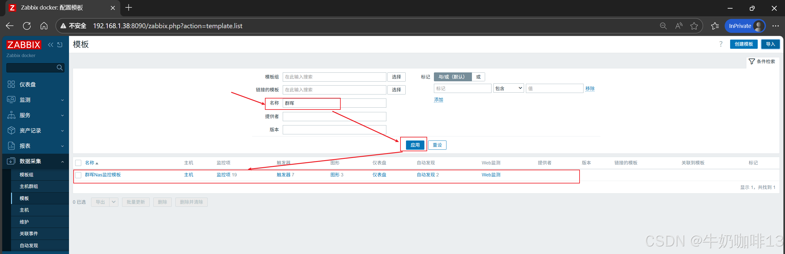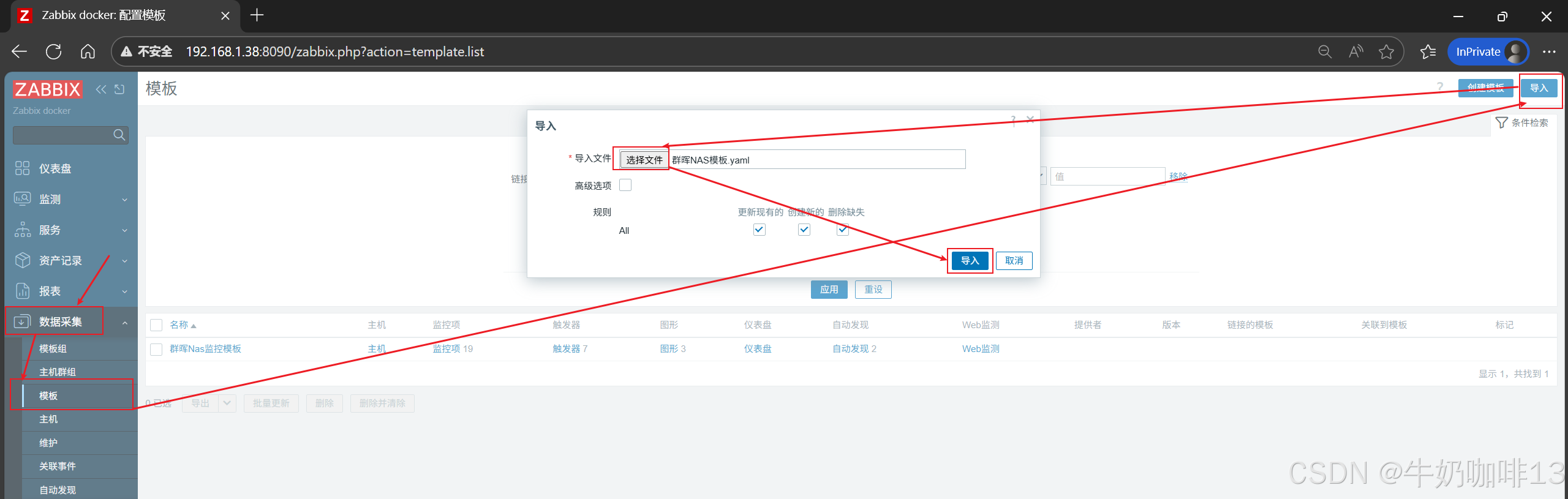 打开zabbix的web界面选择左侧导航栏的【数据采集】-->【模板】-->点击右上角的【导入】-->【导入文件(选择本文附带的《群晖NAS监控模板.yaml》)】-->【导入】即可;在界面上的过滤名称那里输入【群晖】-->【应用】即可查看到该导入的群晖Nas监控模板,详细操作如下图所示:
