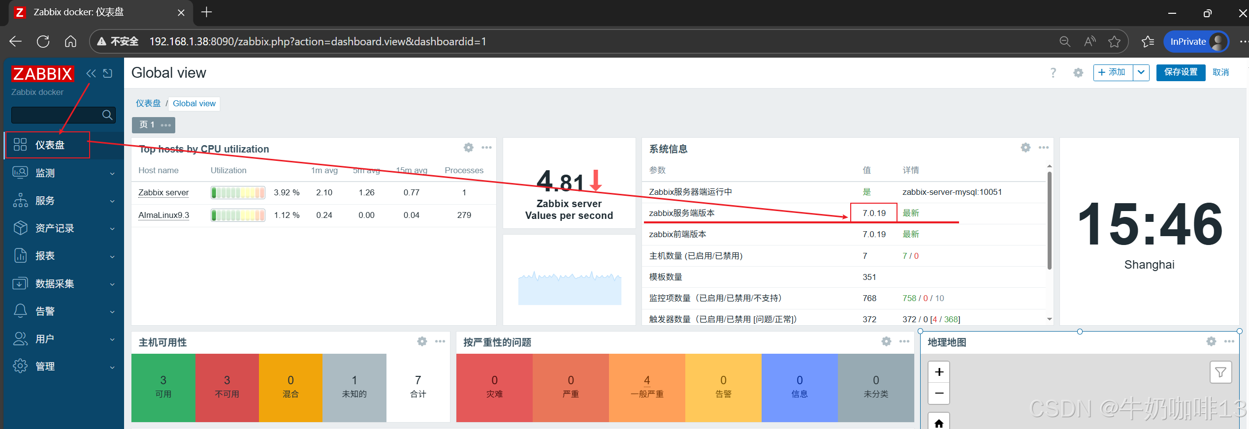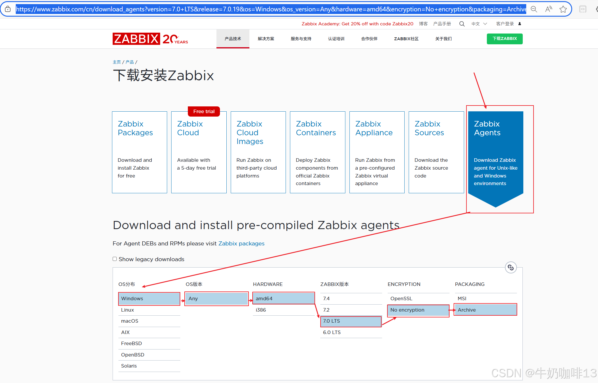 Download Zabbix agentshttps://www.zabbix.com/cn/download_agents 注意:我们在下载被监控端agent安装包的时候需要根据zabbix-server的版本来匹配下载安装,zabbix-server的版本可以在zabbix的web界面的仪表盘右侧可以查看到或者直接在安装了zabbix-server的服务器上执行【zabbix_server -V 】命令查看版本信息。