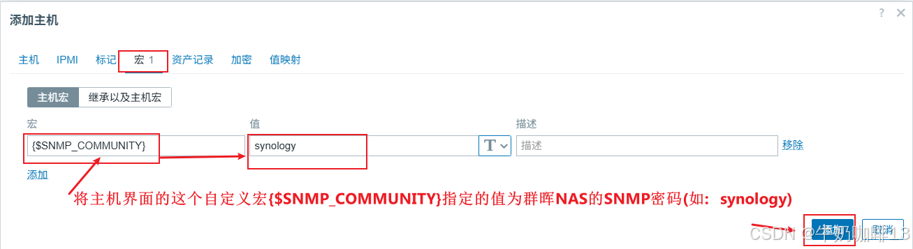 注意:这里的接口必须选择【SNMP】且有一个自定义宏{$SNMP_COMMUNITY}需要在该界面中的【宏】那里使用该自定宏设置其的值为群晖NAS的SNMP密码(如:synology),详细操作如下图所示: