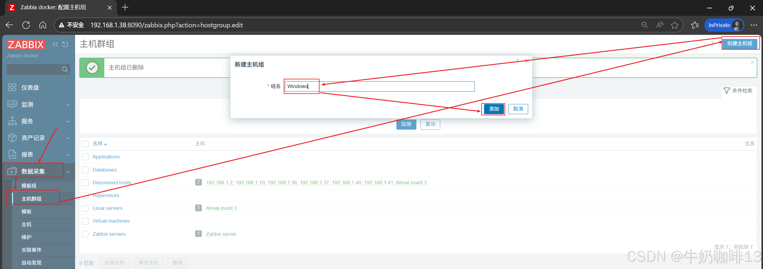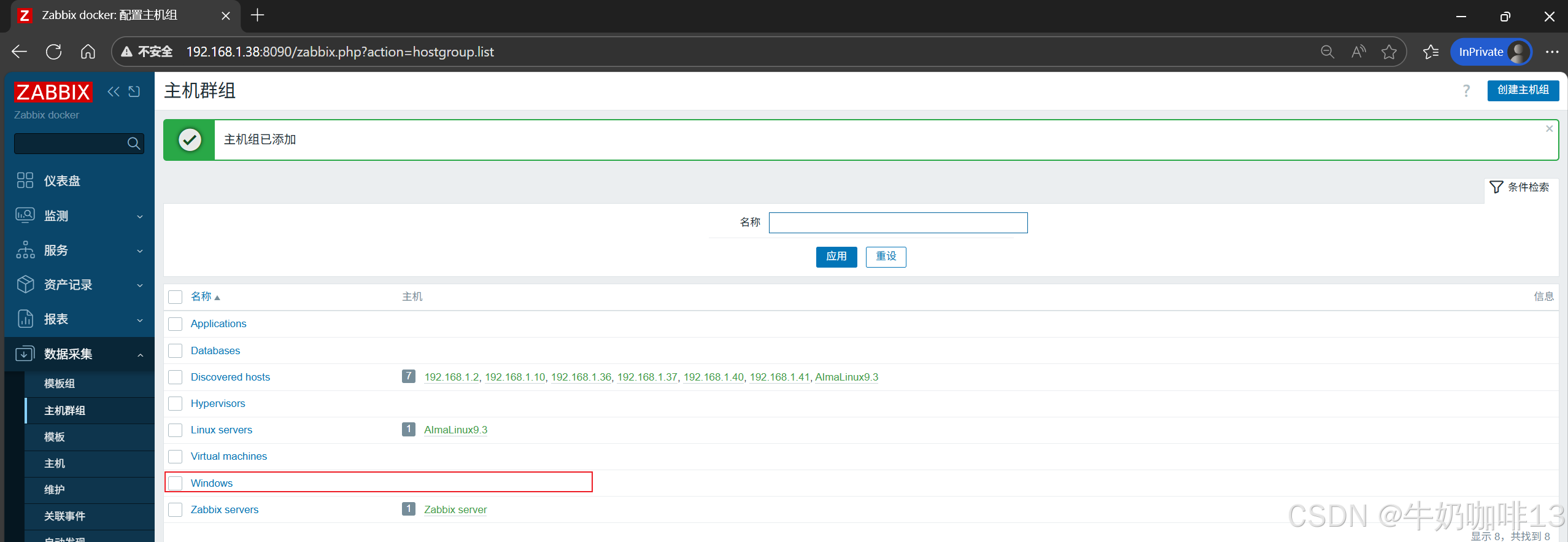 打开zabbix的web网页点击导航栏左侧的【数据采集】-->【主机群组】-->【创建主机组】-->输入组名【windows】-->【添加】即可添加windows组。