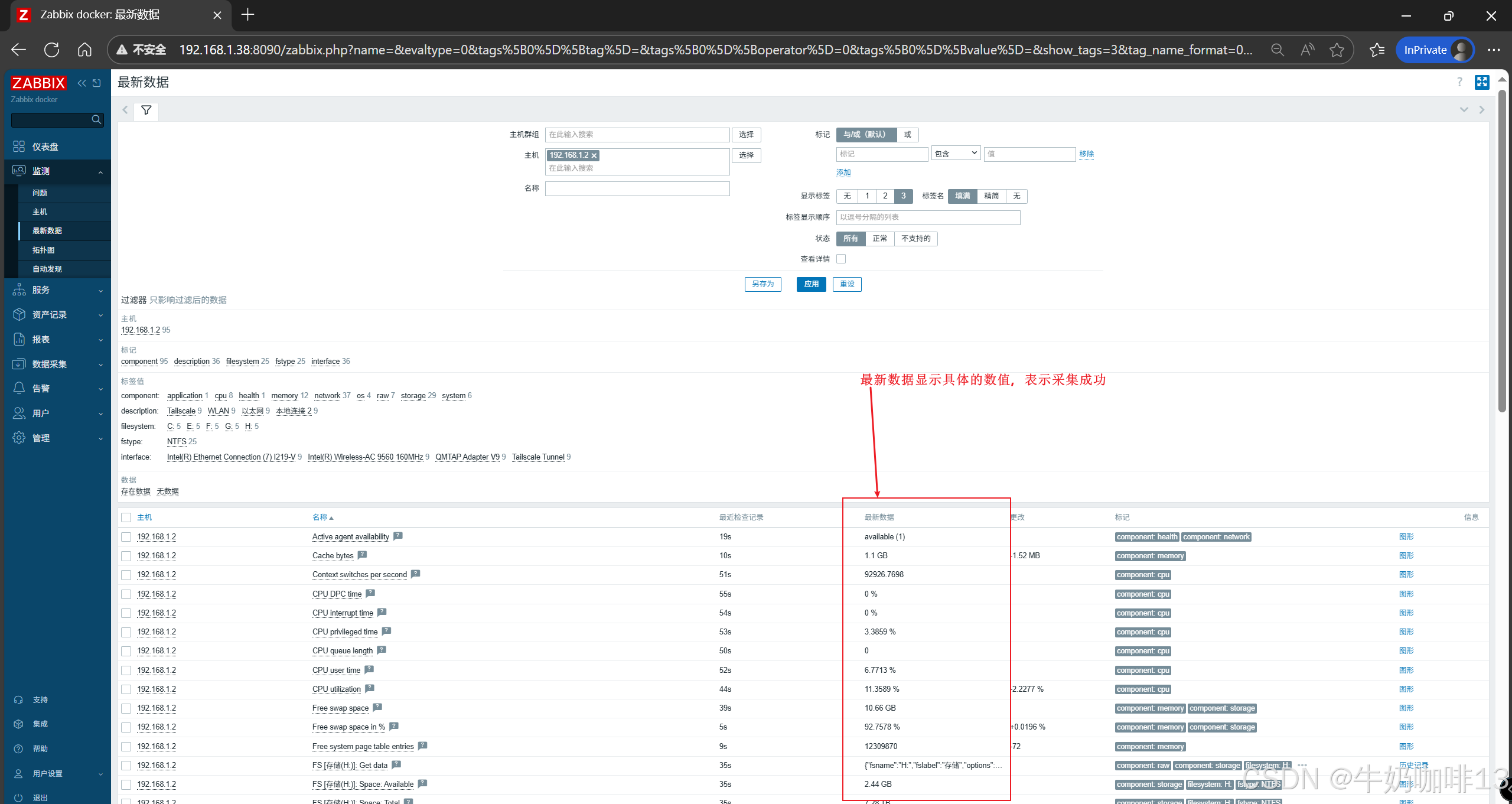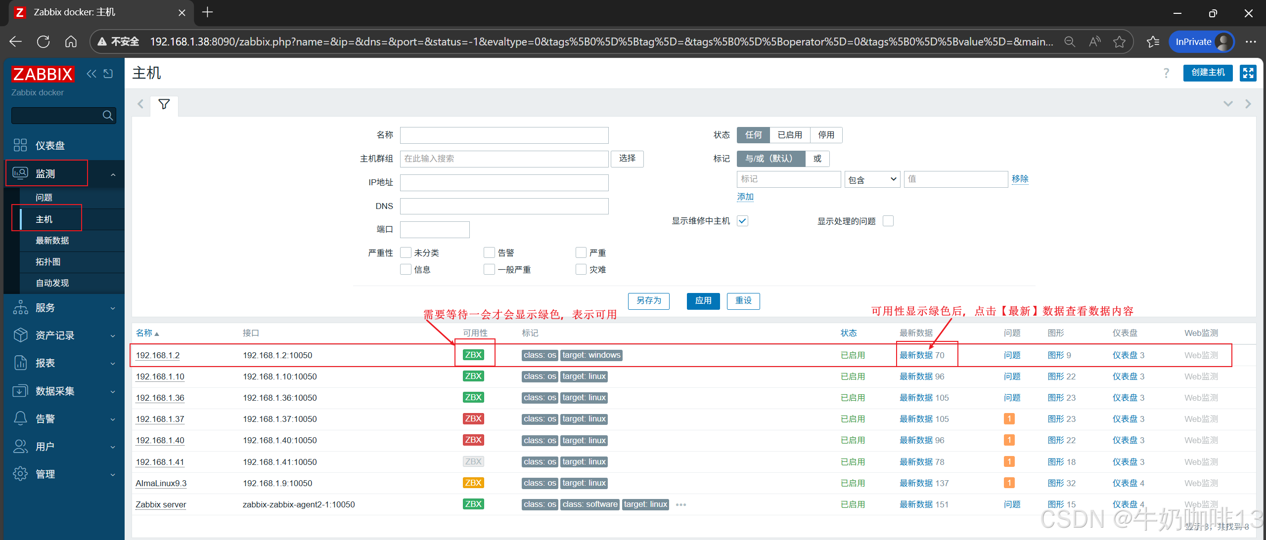 打开zabbix的web界面的左侧导航栏【监测】-->【主机】的列表中查看是否有我们刚配置的windows系统主机(有则表示被zabbix-server监控、可用性显示绿色表示正在采集数据监控中),点击【最新数据】查看是否有数据被采集到(有则表示windows主机正常将数据推送到zabbix-server的10051端口中监测管理了)相信操作如下图所示: