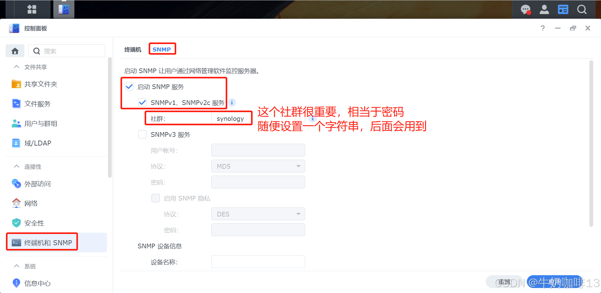点击【控制面板】-->【终端机和SNMP】-->【SNMP】-->勾选【启动SNMP服务】-->勾选SNMPv1、SNMPv2c服务,其中【社群】就相当于密码,根据自己的实际情况设置对应密码后-->【应用】,相信操作如下图所示: