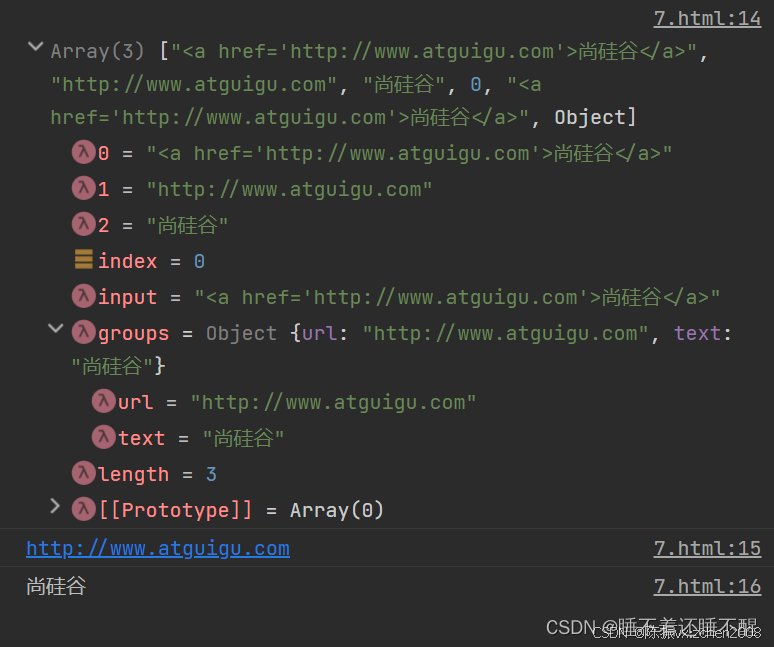 //声明一个字符串let str="<a href='http://www.atguigu.com'>尚硅谷</a>"//提取url与标签文本const reg=/<a href='(?<url>.*)'>(?<text>.*)<\/a>/const result=reg.exec(str)console.log(result)console.log(result.groups.url)console.log(result.groups.text)