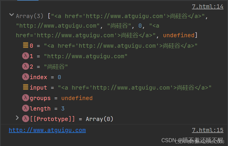 //声明一个字符串let str="<a href='http://www.atguigu.com'>尚硅谷</a>"//提取url与标签文本const reg=/<a href='(.*)'>(.*)<\/a>/const result=reg.exec(str)console.log(result)console.log(result[1])