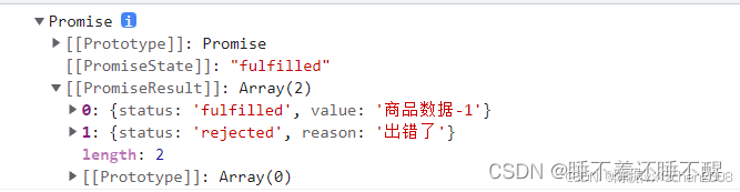 const p1=new Promise((resolve,reject)=>{setTimeout(()=>{resolve('商品数据-1')},1000)})const p2=new Promise((resolve,reject)=>{setTimeout(()=>{reject('出错了')},1000)})const result=Promise.allSettled([p1,p2])console.log(result)