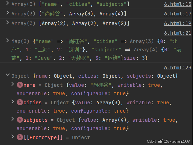 const school={name:'尚硅谷',cities:['北京','上海','深圳'],subjects:['前端','Java','大数据','运维']}//获取对象所有的键console.log(Object.keys(school))//获取对象所有的值console.log(Object.values(school))//entriesconsole.log(Object.entries(school))const m=new Map(Object.entries(school))console.log(m)//对象属性的描述对象console.log(Object.getOwnPropertyDescriptors(school))const obj=Object.create(null,{name:{value:'尚硅谷',writable:true,enumerable:true,configurable:true}})