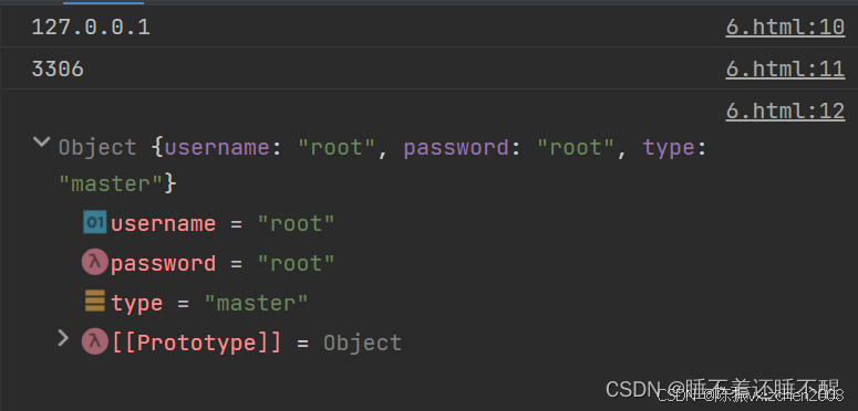 function connect({host,port,...user}){console.log(host)console.log(port)console.log(user)}connect({host:'127.0.0.1',port:3306,username:'root',password:'root',type:'master'})